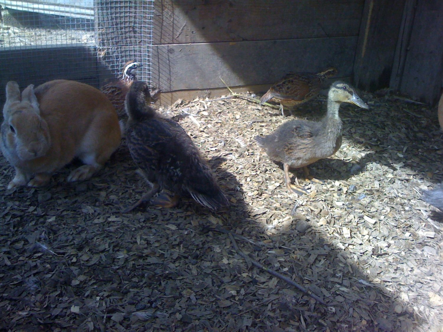 yes they can my female has grew up around my chickens but they can and will dig and possibly dig out i have my hen in with my pigeons and quail and some young chickens house hens that i get from the chicken house that they throw out if they aren't size that they want . but it goes to the temperament to the rabbits as well as the chickens mine first would jump all over scared and some would peck her but i would allow space for they to run and within a week they were side by side together eating but the pen she is in know i have put wire at the bottom and covered it with dirt which she done fine in the last pen before i tore it down but she wanted to dig her burrow and it was long and was really out of the pen and i have dogs that would kill her so i couldn't have that here are the pics there are of some young mallards i have in there til they get big enough to be let out but shes in the background and just ask if you have anymore chickens