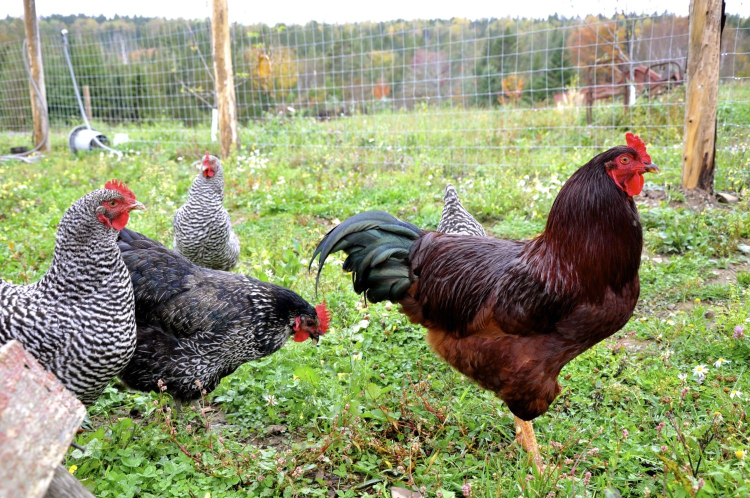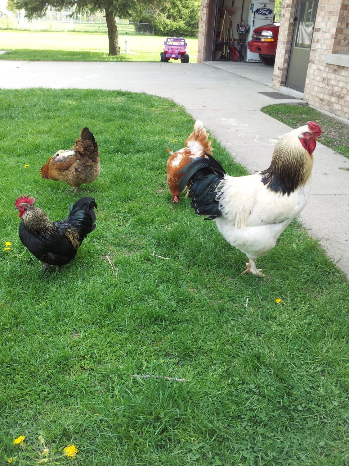 I agree! My roo is only 2 months old and is already very spunky! We let them free range so when someone pulls in our drive way, he runs up to see who it is.Am I the only one that think the roosters are the best part about having chicken? I mean, I love hens for the eggs of course, but roosters are so entertaining! And so beautiful! I give my roosters 'hug therapy' from the time they are chicks -- here I mean that each time they are bad I pick them up and hold them until they don't mind and realize humans are the boss -- and I've got super nice roosters! I use a purebred rooster all the time (so the offsprings don't continually get more and more mixed), and the hens are purebred and mixed. I find sex links can create pretty funky looking birds and I like it! Here's a photo of my Buckeye rooster and one of my sex link hen, and my Barred Rocks:I actually find the sex link prettier!! Maybe it's because she's the nicest of the hens and I'm a bit bias?! Hehe. And then I have my bantams...the rooster is a cross between Mille Fleur D'Uccle and Silver Phoenix and my hens are mixed (they look like game hens). I just hatch some eggs in the incubator (which is such an amazing experience!!) and look at the funky chicks I got...since I don't show my birds, I've really lost interest in this purebred thing. They all lay eggs and they're all beautiful!!