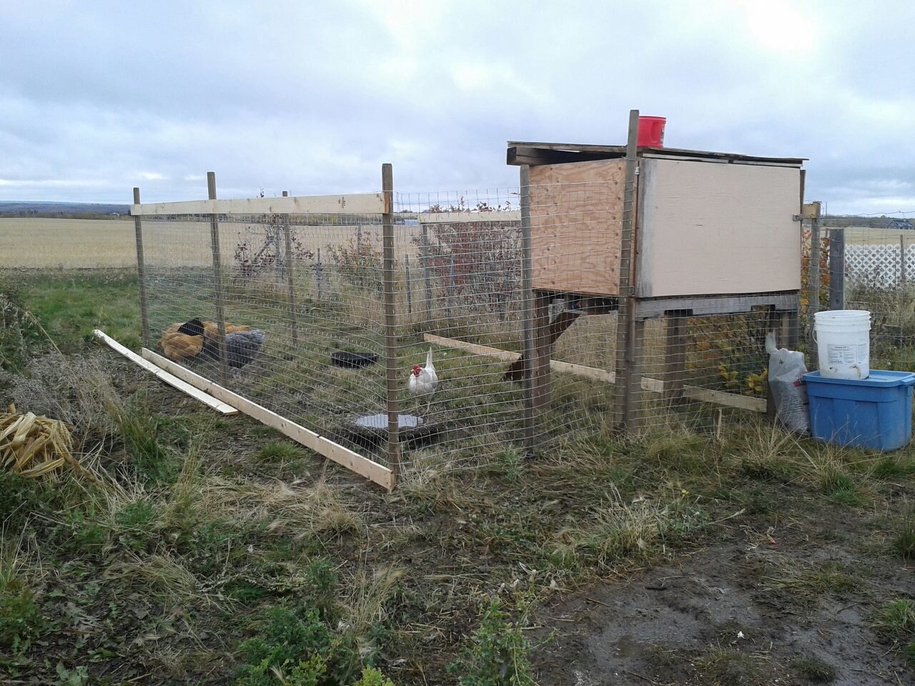 This is my coop and run. The only time they use the coop is to sleep now that I have their health back up to snuff. There's been some changes since this photo was taken, but underneath the coop is a big pile of Hay that they cuddle in during the day. I have 10 birds in there, but wouldn't put one more in and if they didn't all get along, i'd probably have issues.