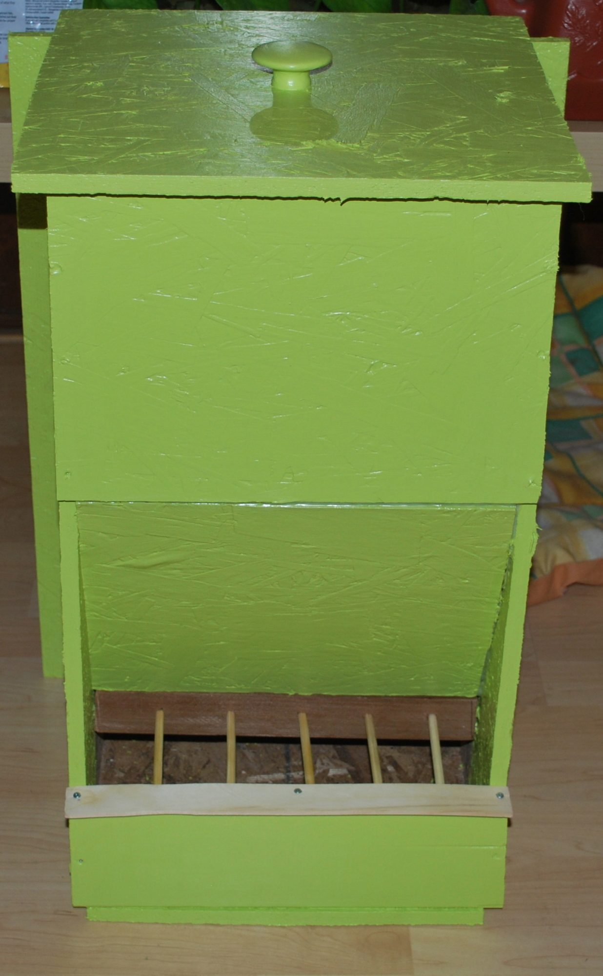 Also I was a little creative in the last few days, I made myself a Feeder which I can hang on the Wall. So this is my first try and I did paint it ( not finished still a little to do) so Mites do not have so much room to hide in there. If it works out good than I gonna build a few more and hang them in the new coop. When I do the next one I will use different Wood, but for this I just used up what we had.