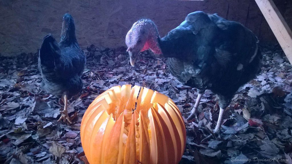 All I did was rake up a ton of leaves & toss it in a big pile in the middle of the coop. I didn't even spread it out. The birds did all the hard work for me. That pumpkin (the treat) was left to sit in the middle of the coop. I just pile stuff there - they rake it everywhere & turn the compost. Probably the easiest way to maintain a coop, imo. I just rake the stuff out every Spring or Autumn (Spring to steal compost, Autumn when Iget more leaves/garden scraps). Easy peasy.