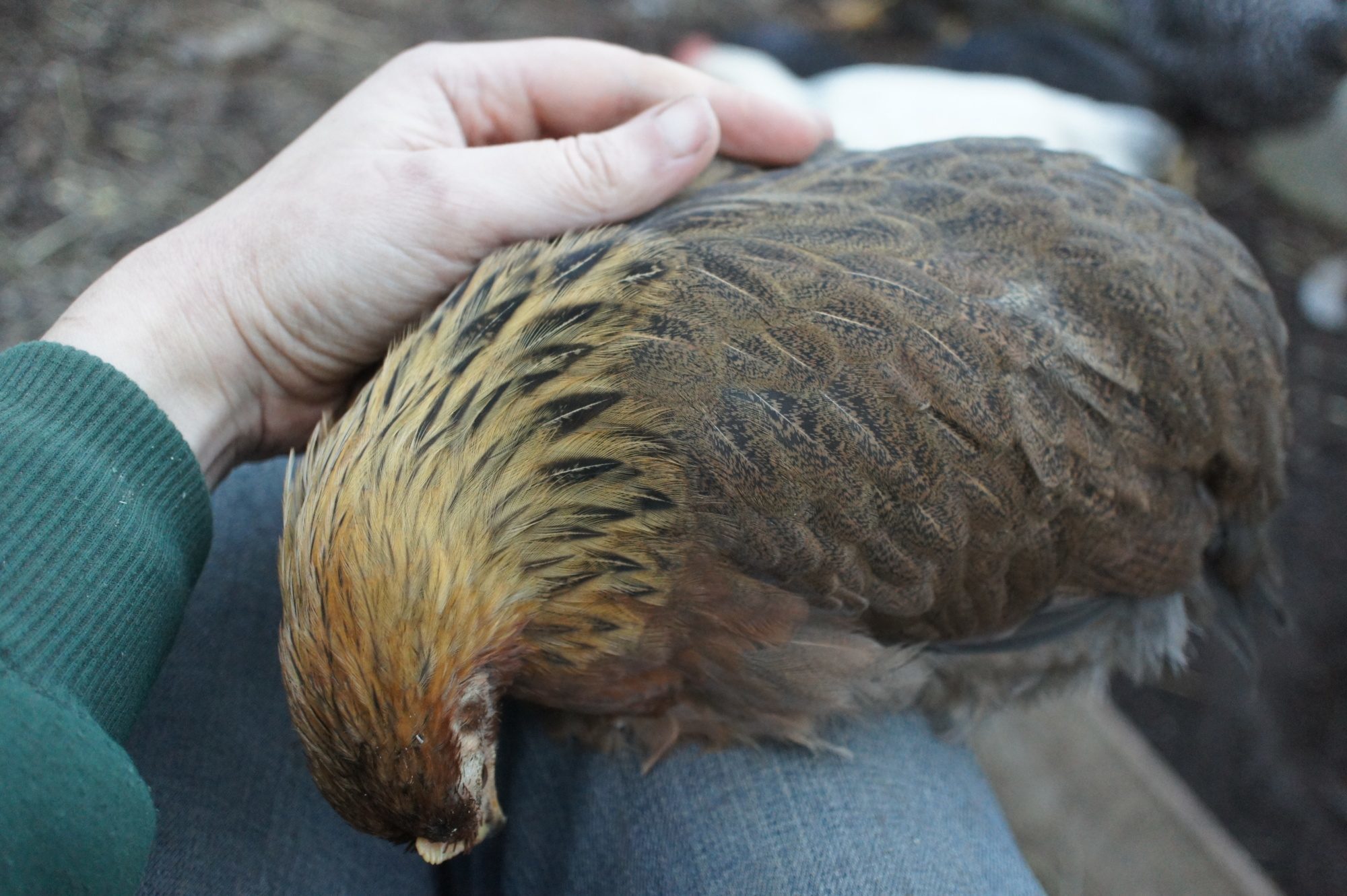 By the way, here is one of our Barred Rock pullets, named Lapushka, hugging me. She is at the top of the pecking order in the 'teenage flock', but such an adorable beauty! 13 weeks old here, and she is very big.