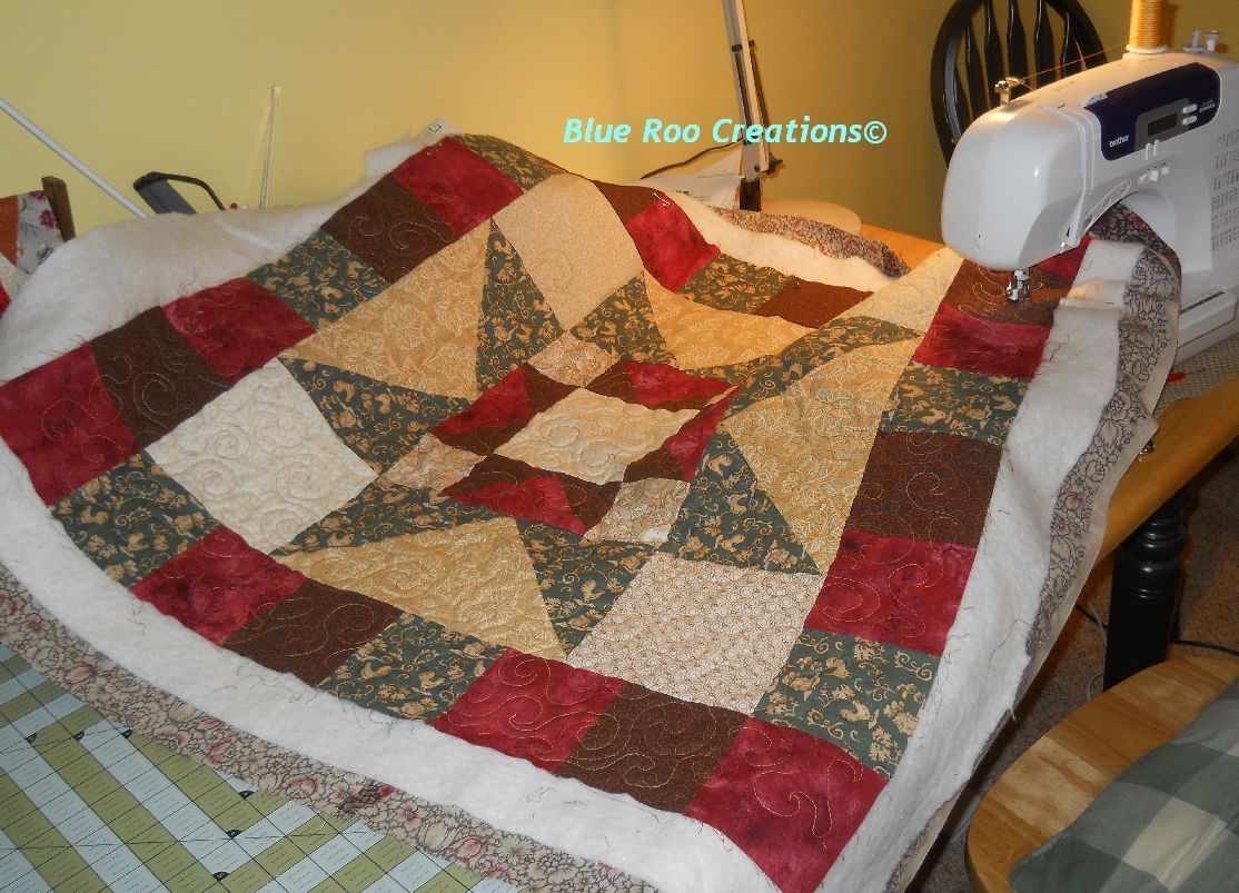Here is the wall hanging I am currently attempting to machine quilt. The throat space on this machine is so limited, it's making me crazy. Visibility is almost nil, can't see where I'm going, can't force the piece through and at the same time, see my path and control the stitches. Being the perfectionist I am, recovering as I try to be, I am not thrilled with the results. It's not horrible, but it's not great, either.