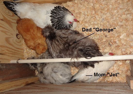 The mom is a black winged white Jap and the father a blue silkie roo..