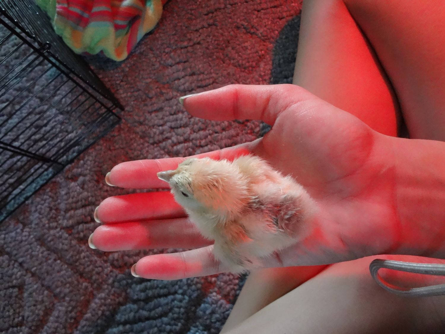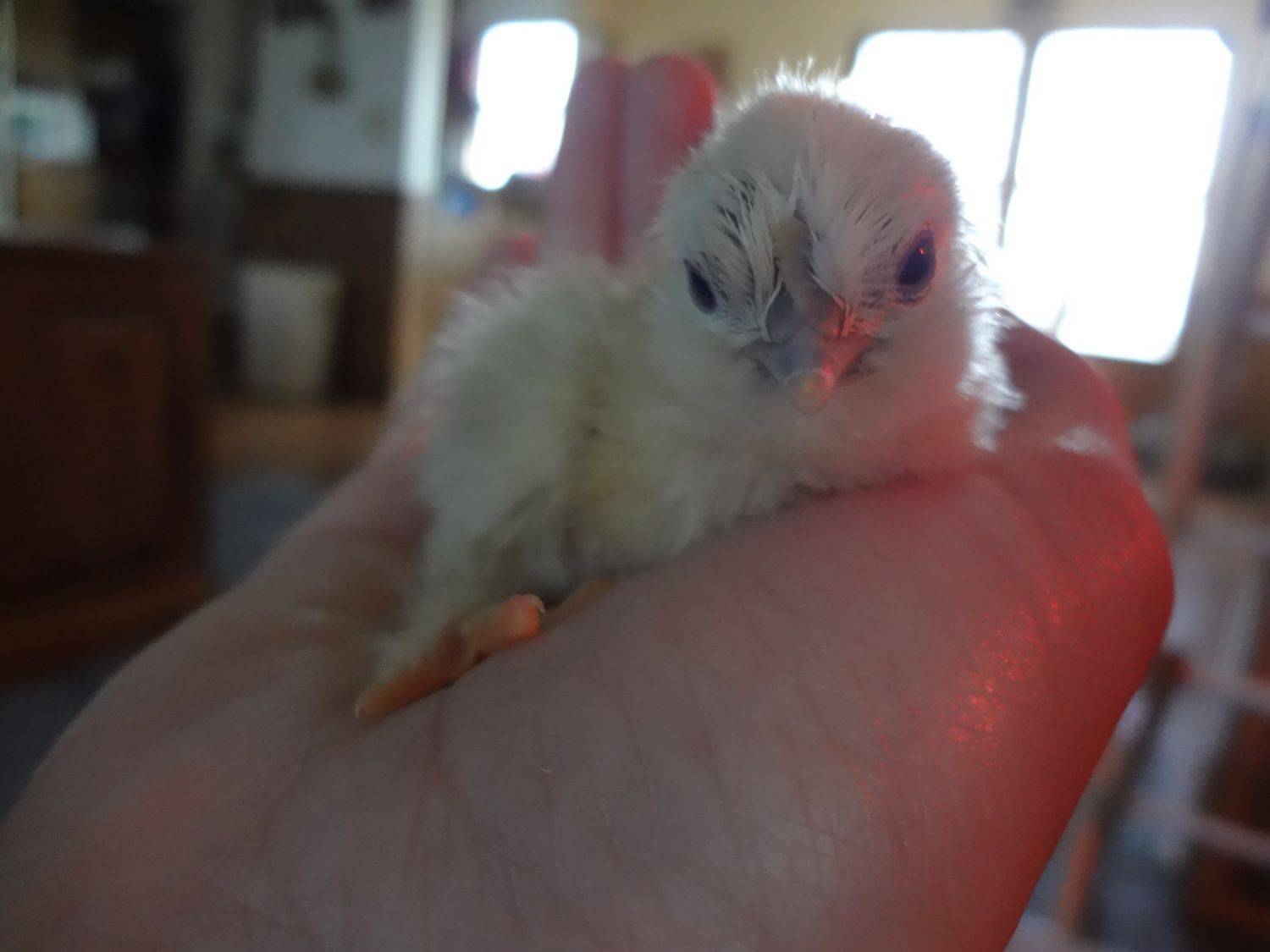 The chick has a lot of silkie qualities .. six toes on each foot along with feathers, looks bearded, black skin, grey beak.. otherwise it is white like mom with a single comb and yellow feet