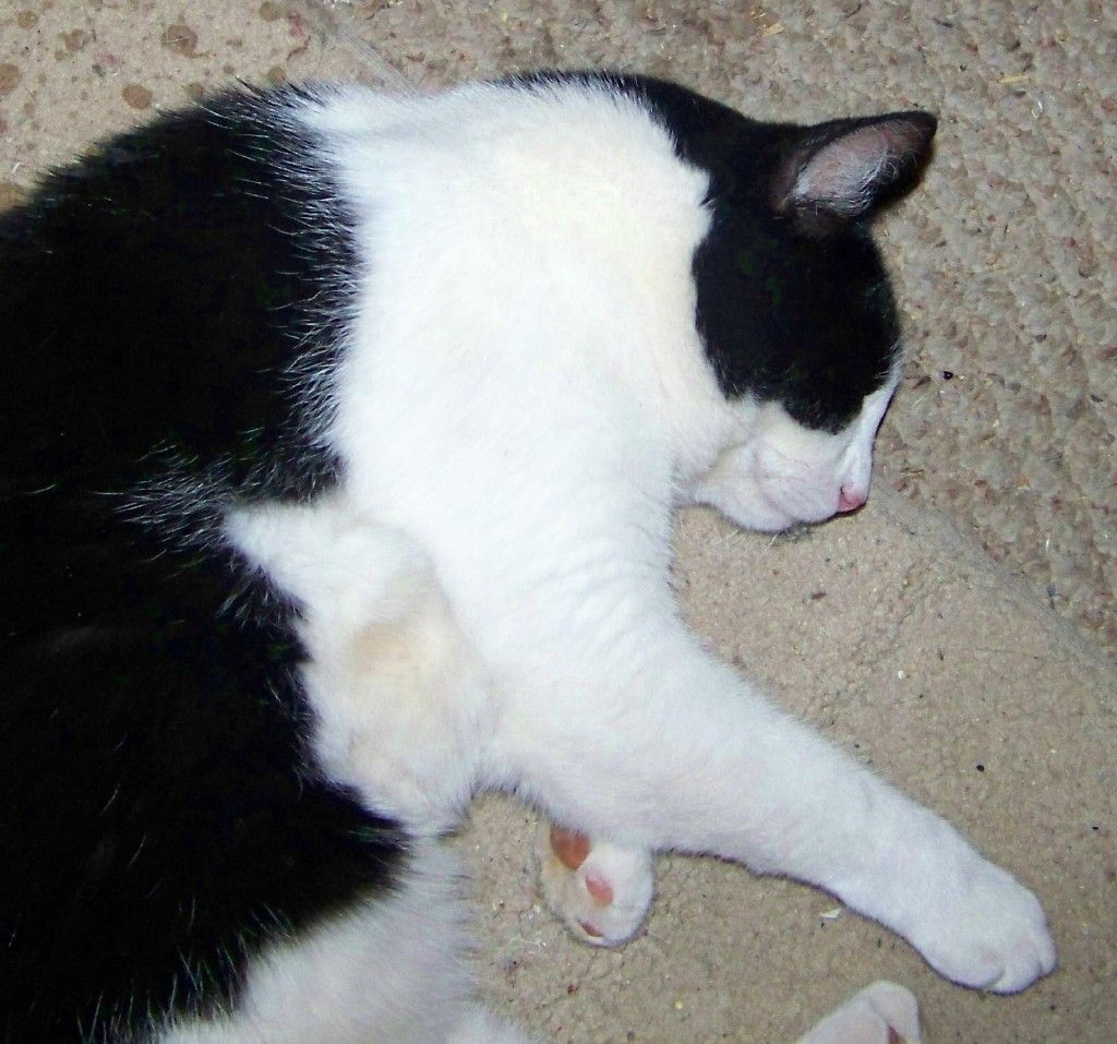 so that's good thing, but if he was a problem i would chase him off, but since i first saw him , he is doing good around here & im so glad to have him he is a good hunter , & our former wild cat who is now our house cat we named her spot is very guarding about her home & property &has been chasing the new boy around , i believe she has laid the law to down that the chickens not to be harmed & she always guards all our birds & i would not have it any other way, she is much like a dog in that respect & follows the hens around guarding them like a dog would guarding its heard & sleeps by them like a guard dog would, wile they are out free ranging every day , so between these 2 black & white spotted cat, this is a pic of our house cat spot , sleeping on the job HA