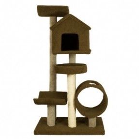 Structurally you can see that the base is large and heavy and there are 2 kinds of heavy "units" close to the bottom as well. And the house, while hgh and heavy is centered on the base. All that makes it very stable. Our 13 Y/O cat likes to sleep on the base between the left and middle post during the summer. In the winter she sleeps on the round platform or in the house. There is a hole in the right side of the roof of the house so a cat can climb from floor to the highest level without having to climb a pole. The 2 younger cats like the top curved piece in the winter which is on its own post. The youngest one will climb right up that post. They DON'T share the space. Not sure I've ever seen any of them hanging out in the big round open one nor the lower curved one.