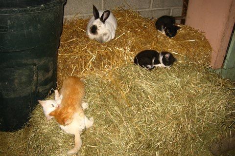 Here is Tiger and Scardy with Ginger and her brother Fred, the two silkies. We got them from the same farm and they all got along. Now the chickens tend to chase the poor cats, who never hurt them or stalk them.