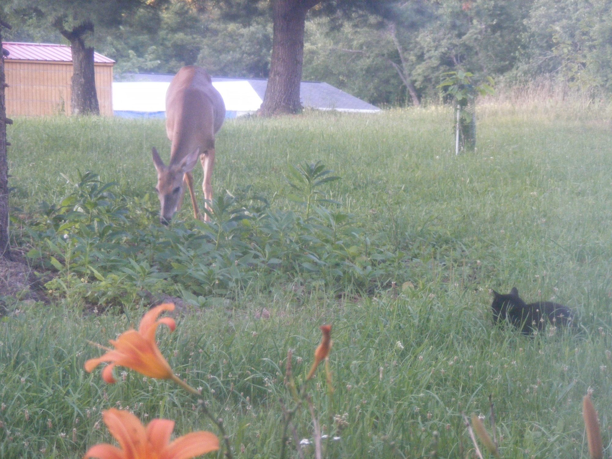 Check this out my cat Colby thinks he will eat deer tonight he sat and stocked this deer for a hr. or so while the deer was eating apples . So funny. The deer would look up him and he would get closer and closer to her .