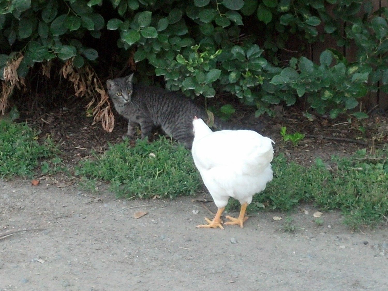 The chickens are so use to my neighbors cat they are now chasing her when they see her lurking around. Mostly my speckled Sussex does the cat chasing but Brie my white Plymouth rock decided to do some herding too :)