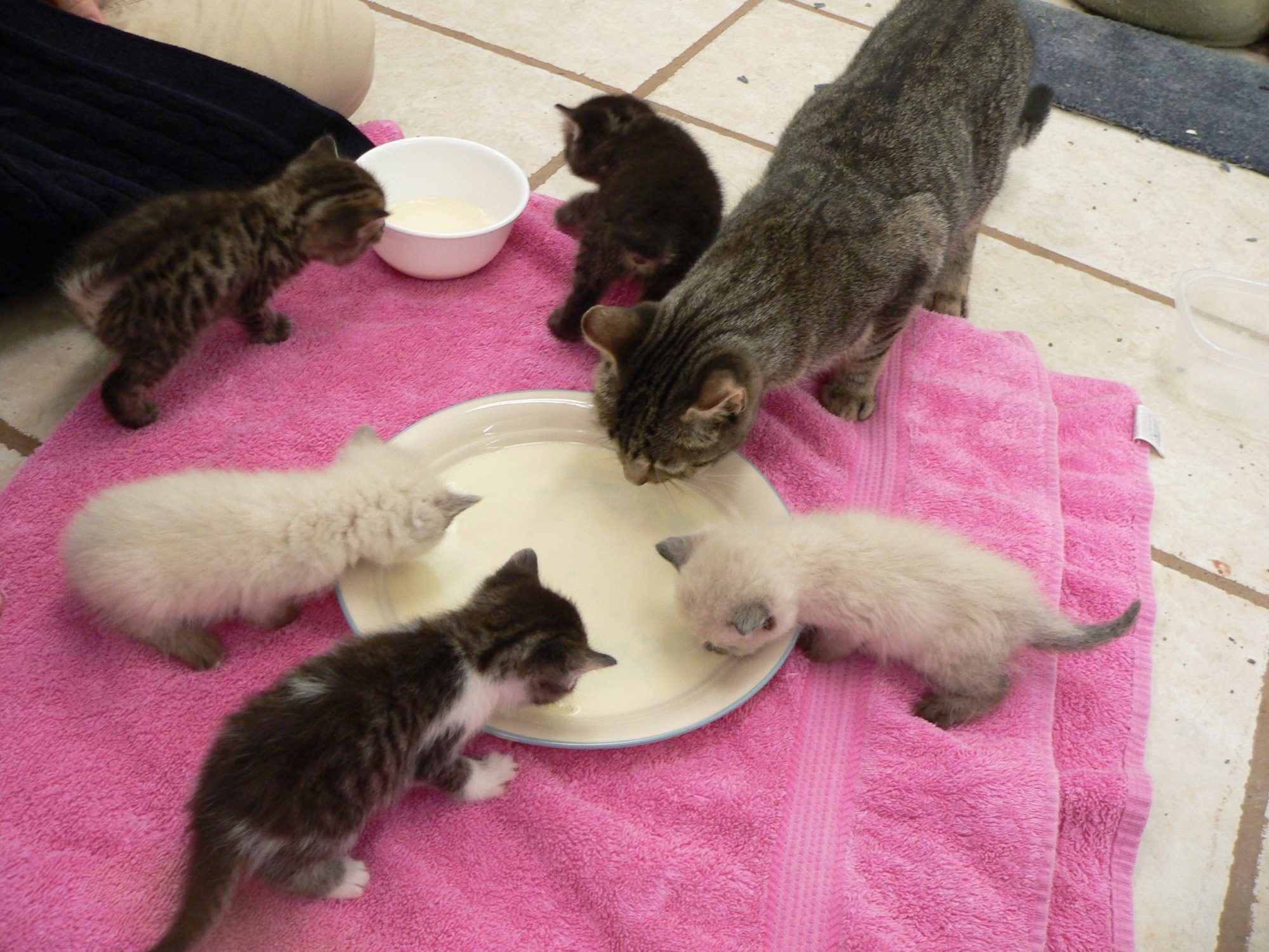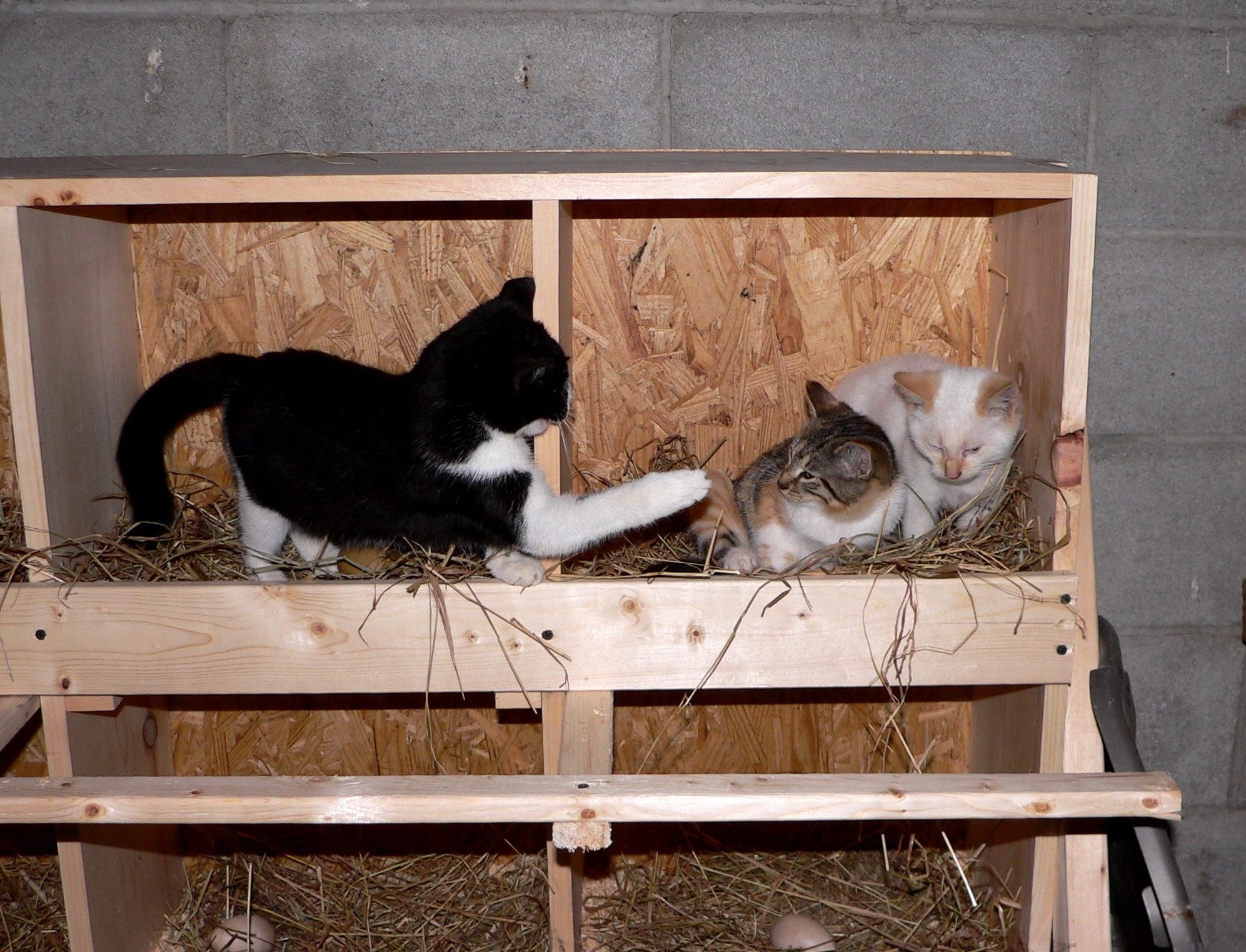 Our first cats were three that we got from friends. All barn cats, as three people in the family have allergies, they took to the barn pretty well, and came along with some chickens too. They included the black and white cat, Millie, and her younger "siblings" Tiger-tail (cream point) and Scardy Cat (patched tabby and white).