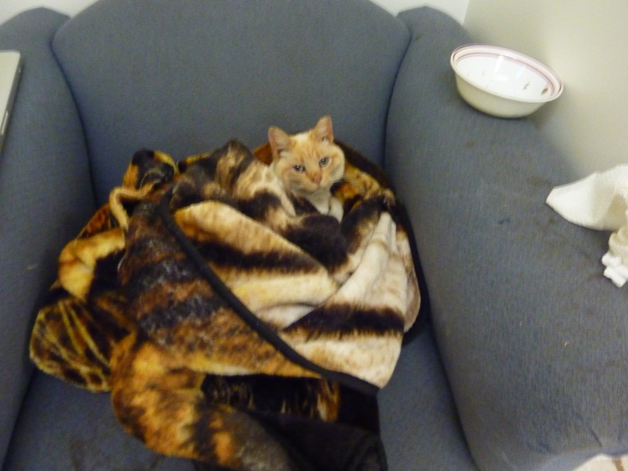Poor little Tiger, feeling better after his attack. He had a terrible fever and an awful limp, but he healed up completely after a few days in the basement with some antibiotics. However, he has learned how to avoid antibiotics unless it is really mixed in with wet food. I think he is tired of taking it.