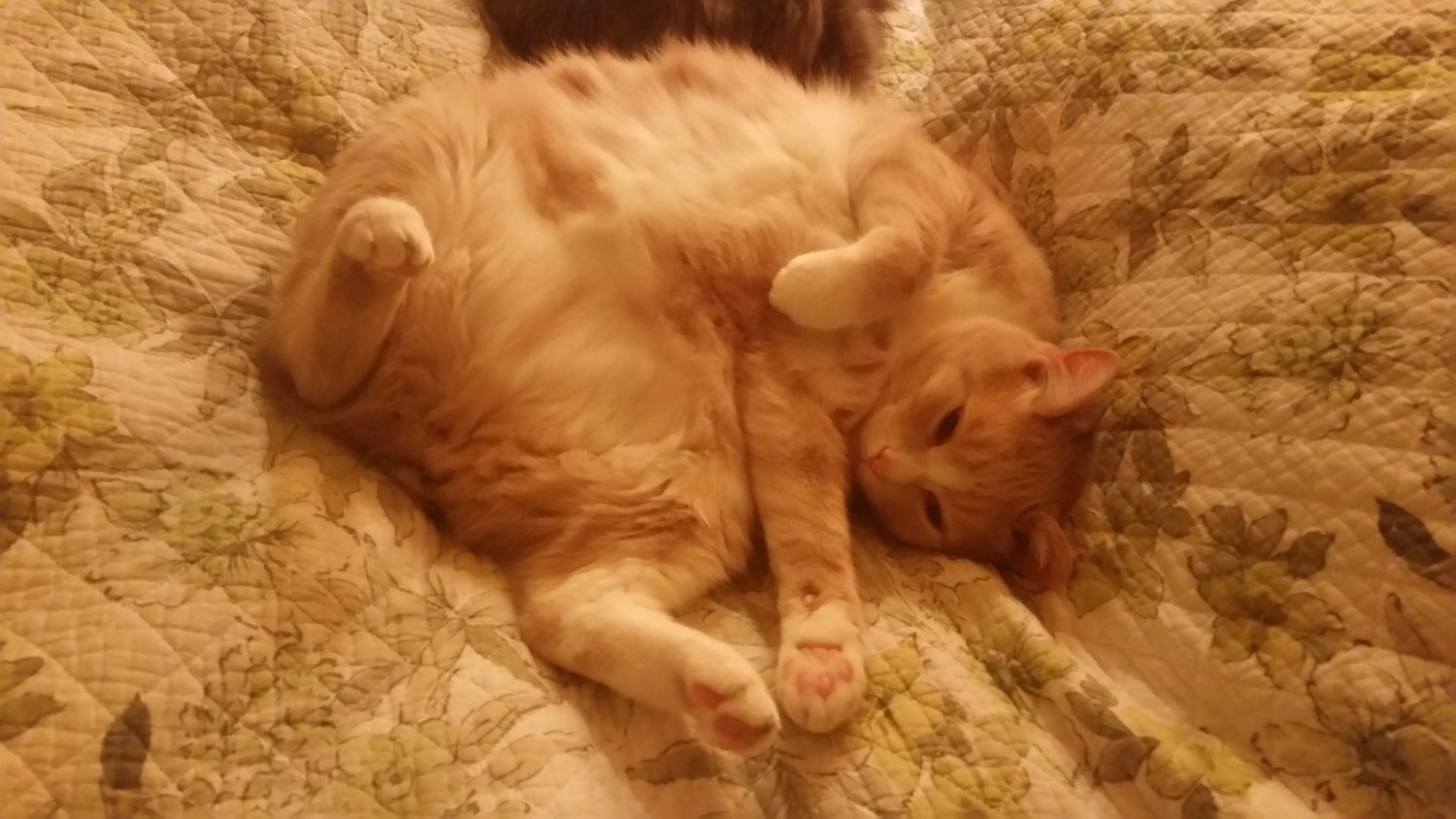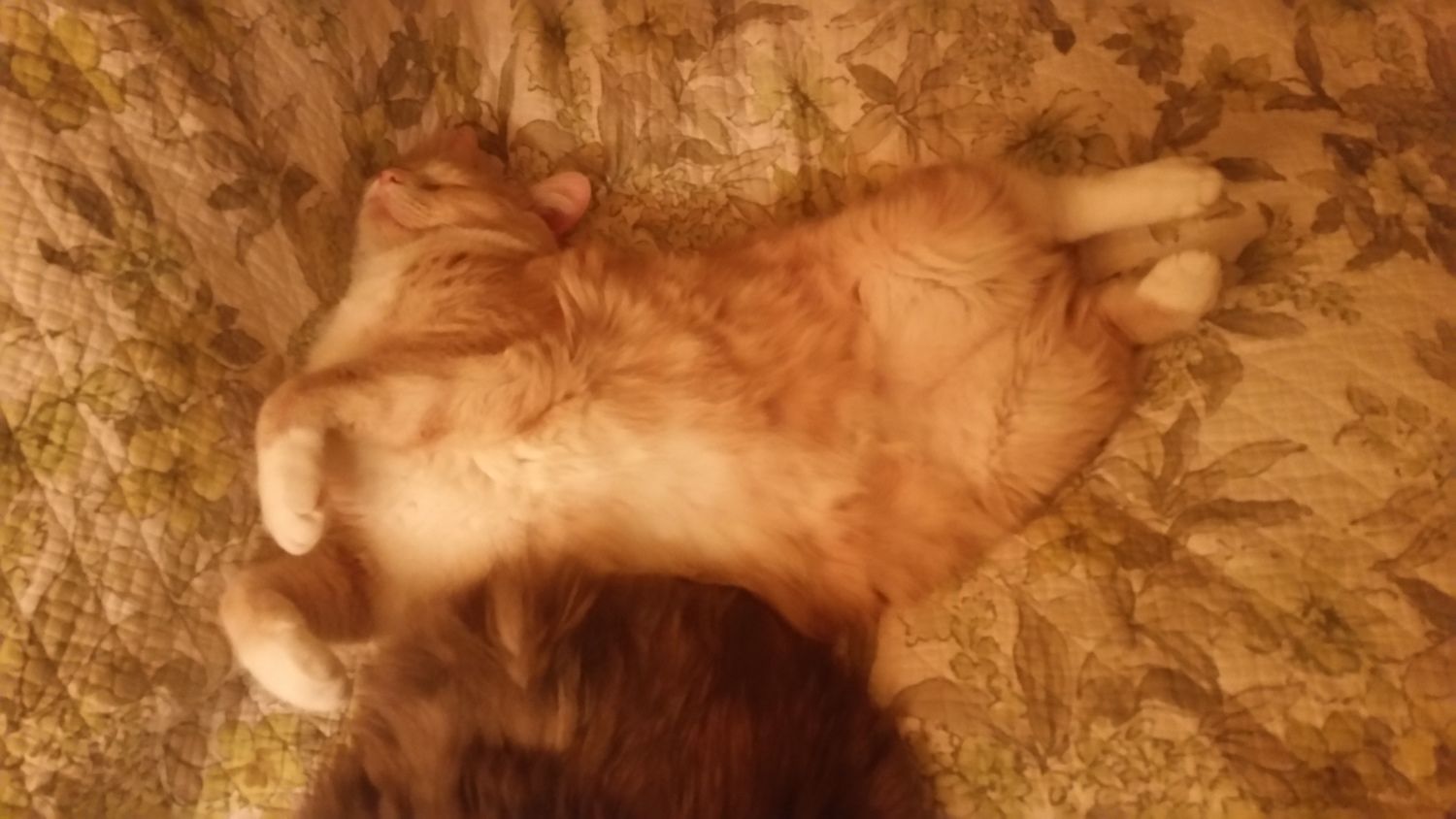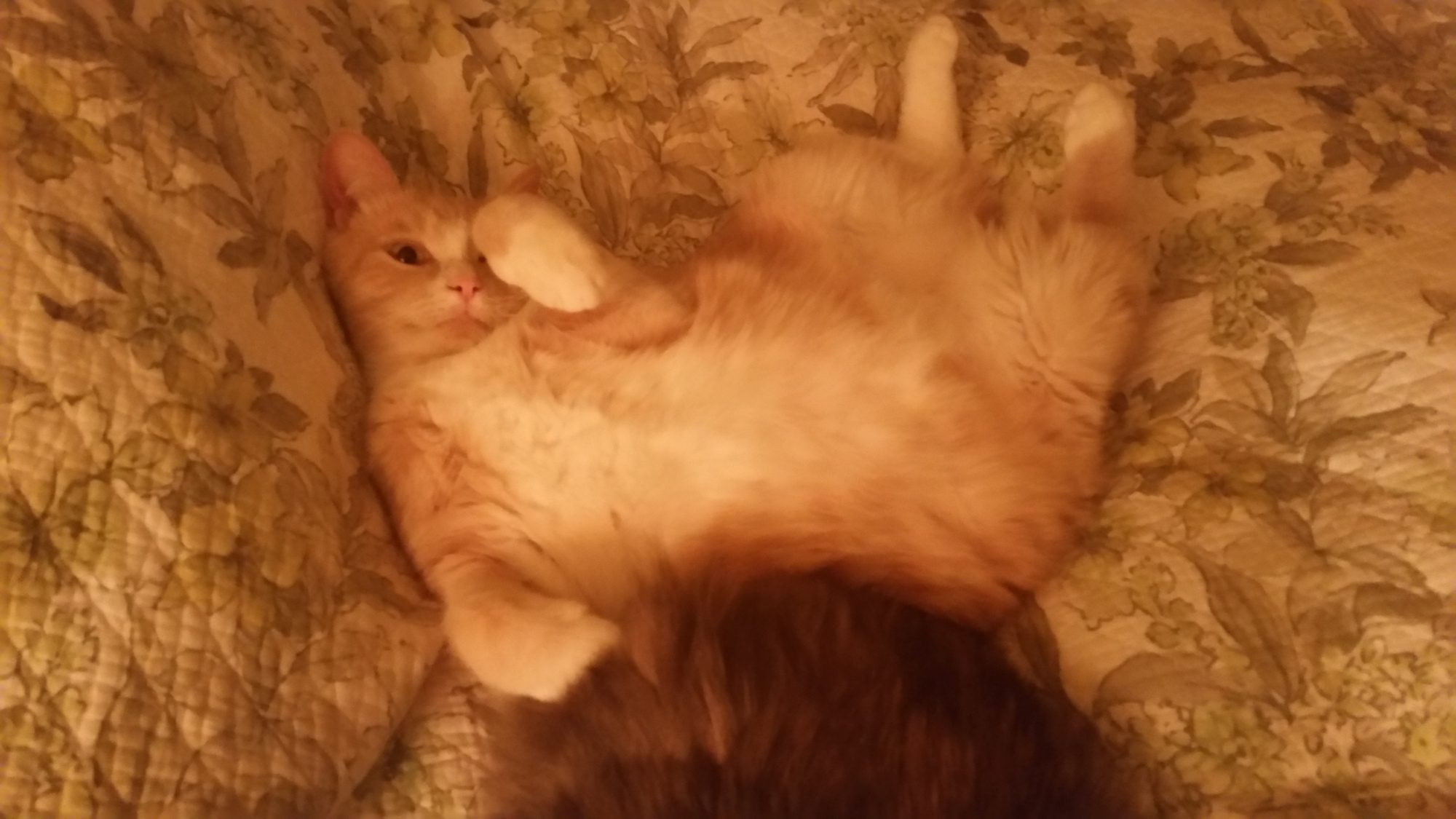 Orange-cat (Sherbert) was another stray that came our way. He had a thick coat and use to be terrified of us, but we own him over. The other cats, however, didn't get along with him. He attacked Scardy, Tiger, and Pi, nearly killing Tiger, and leaving him covered in wounds and near death. We got him fixed and then found him a new home.