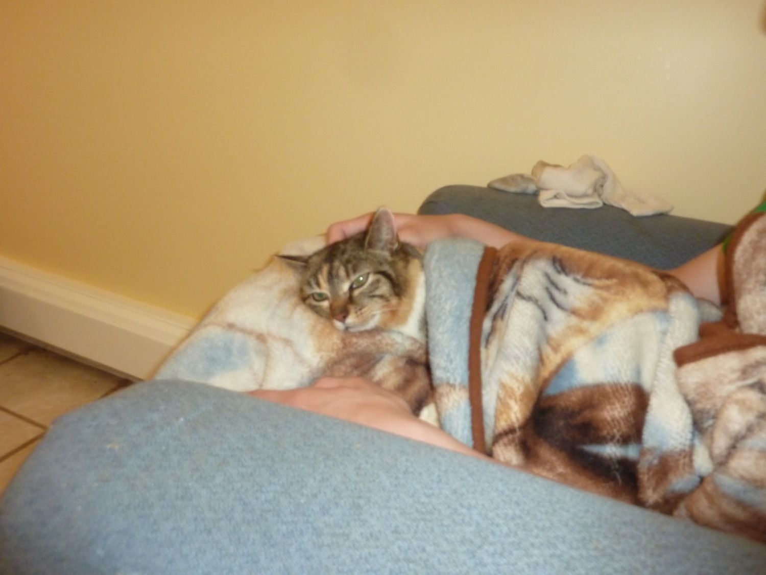 Scardy, resting after an attack from Orange-cat. She doesn't usually get to come inside, but she needed some medication for her limp