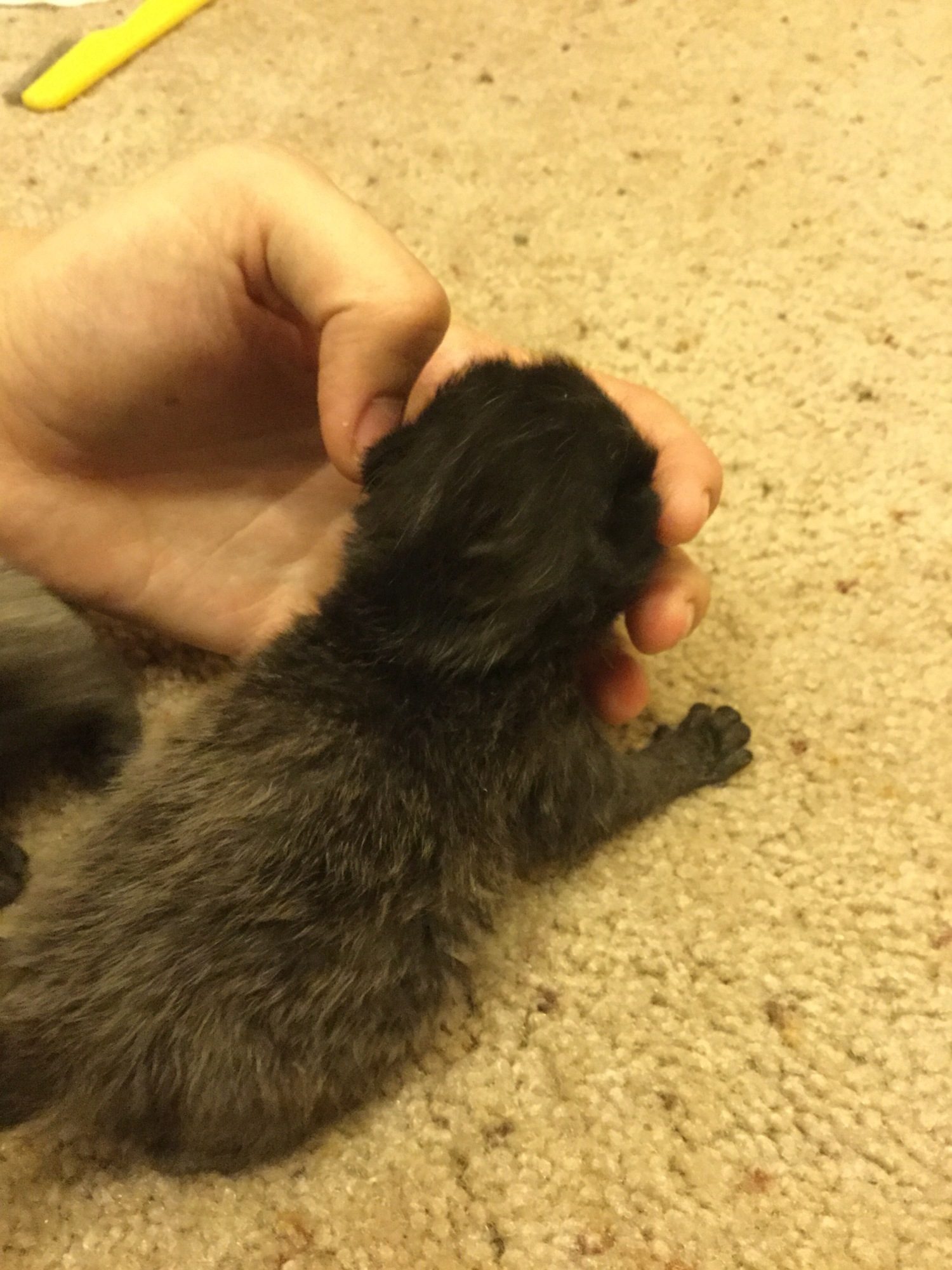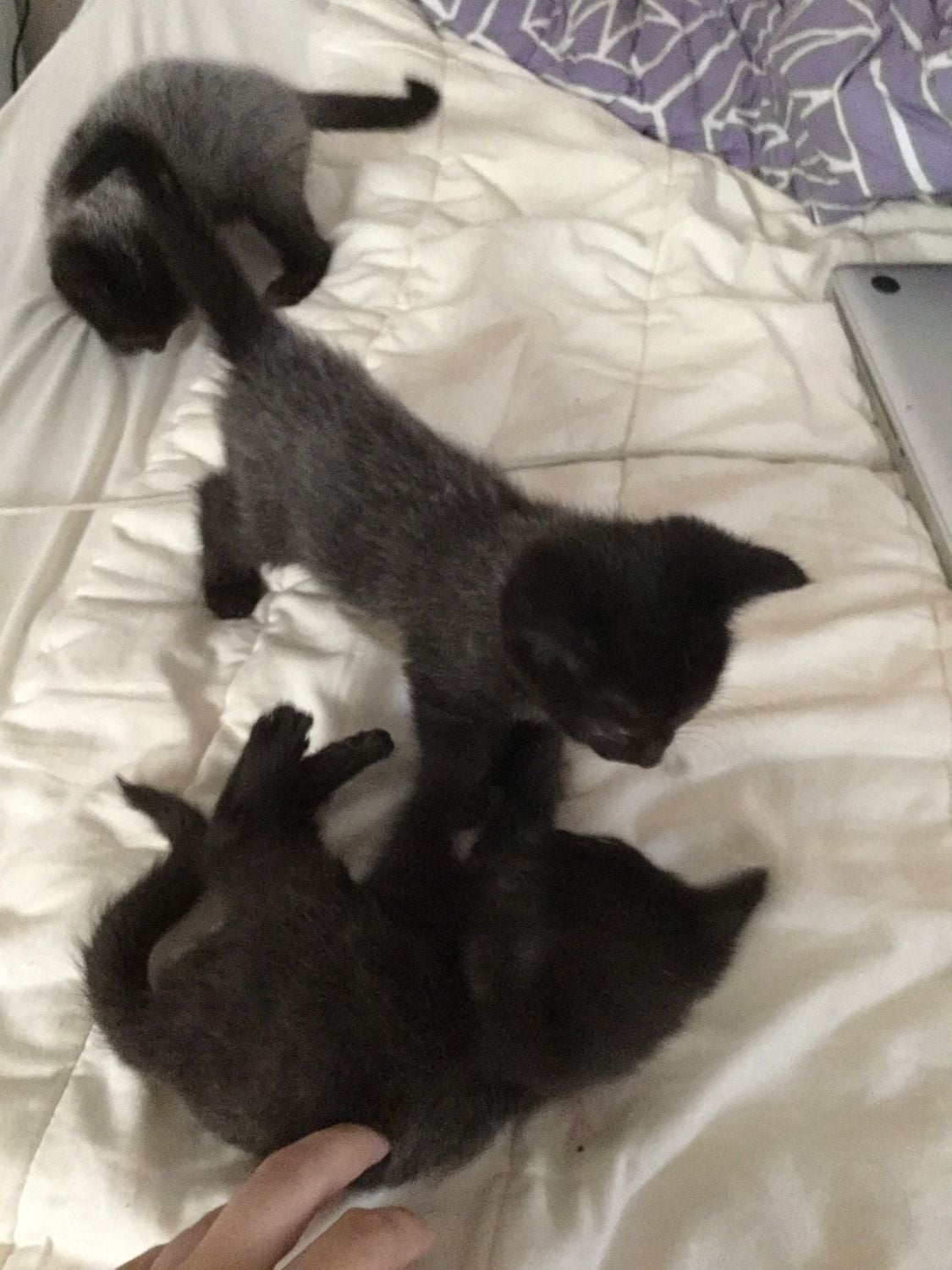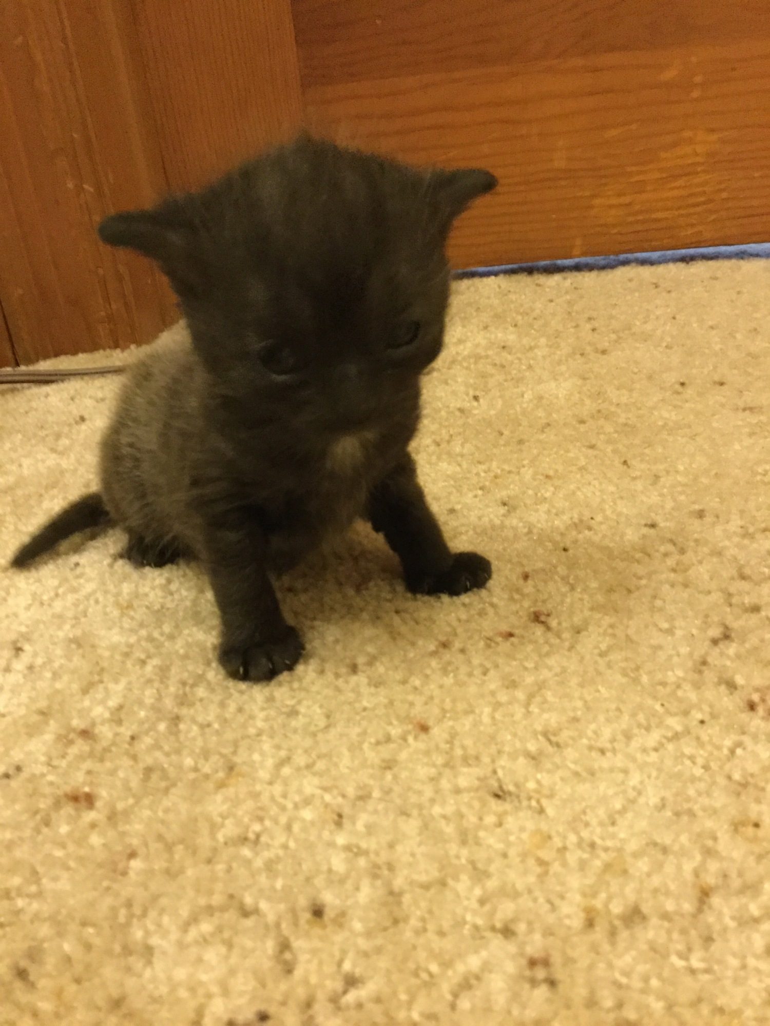 I've got some awesome news! Nocturne, one of my foster kitties, is going to be officially adopted today!!!!! She is a special needs girl, she has hydrocephalus, or spinal fluid on her brain, which makes her a little different then the others. But she is one of the sweetest things I know. She just now cuddled up next to me and is chilling while her sisters play near-by. Here she is, 10 weeks old and adorable! She's even got some food on her noes. I was there the moment she was born at the shelter, helping her because she was premature and weak. Two of her siblings passed away. She was so tiny, always prone to wandering. Even at just a couple days of age we had to put a belt through the cage door so she couldn't crawl through it and get lost. At a week of age she was the size of a day old, as were her siblings, and she came to our home to be fostered. Lyla, her mother, Twilight and Oziana, her sister's, and little Nox herself. She grew. She was the darkest of the kittens, with a lighter back-half and darker front-half. She needed to be stimulated to use the bathroom because her mother was having trouble doing that herself. She started to crawl around. They slept most of the time, but Nocturne was always either hiding in the back or crawling out to the door of the walk-in-closet where she would have to be picked up and put back in her nest. Here she is, staring a corner with her sisters. Her head started to get very round and large and her eyes bulged. But she was learning how to eat. She was moved up into my room at about 4 weeks of age. Her mother was always sweet and nurturing, giving them plenty of milk and love. But she would cry (okay, scream really, really loud) for attention at the door for cuddles even at a young age, toddling her way to the door and crying to be held. She loved tummy tickles. But still played with her sisters too. Always sweet, very limp when picked up as if her mother were holding her. Easily startled at first, but now just very cuddly. She is 11 weeks old, vaccinated, and ready for her new life. : )