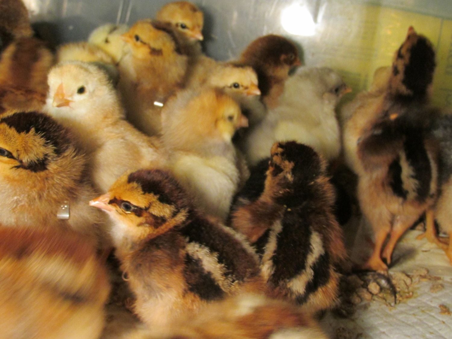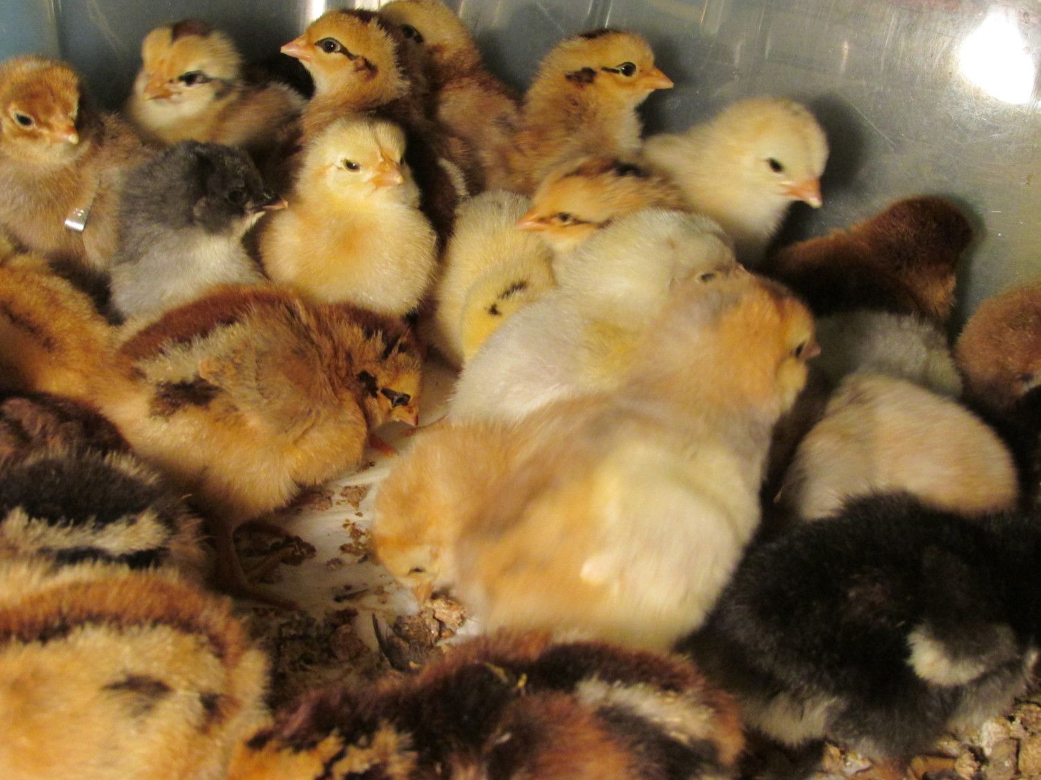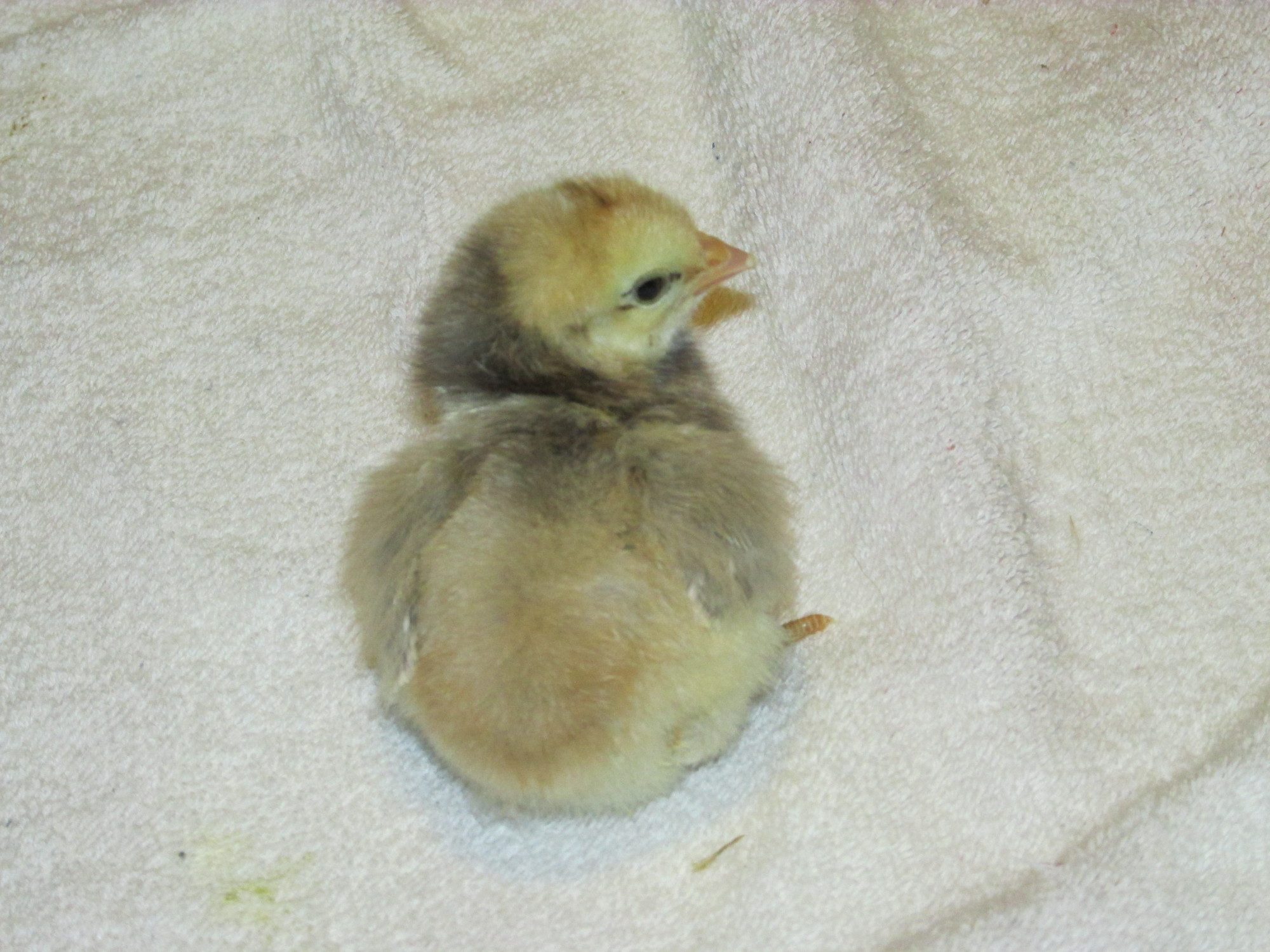 Nice colored chicks.@draye - yes, I usually only count the fertile eggs for hatch percentage. Actually, this time I had a few extra eggs under broody hens (not included in the total), but about a week before the hatch, the hen forgot which nest she was on, so the eggs got cold. Yet, 3 chicks still hatched (4 but one hatched early, fell out of nest & died), and I think there was 10 eggs total. Usually the hens have a much higher hatch %, but I was gone all day & left the door to the "broody nesting box" open, hence why she was able to switch nests. Not the best photo, but the 49 total chicks that hatched (one assisted chick, zipped 3/4 around but then membrane dried out + broody hatched chicks) were adopted by 2 broody hens & they're raising them in the outside brooder coop with the help of a "mama heating pad".A few of my favorite chick down patterns that are unique: I've had several similar to this hatch before, where the "chipumunk" stripes are in blue, not black.