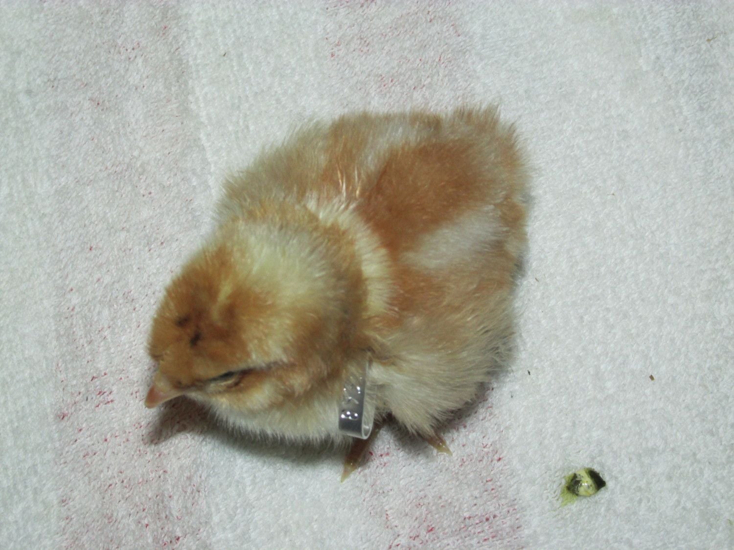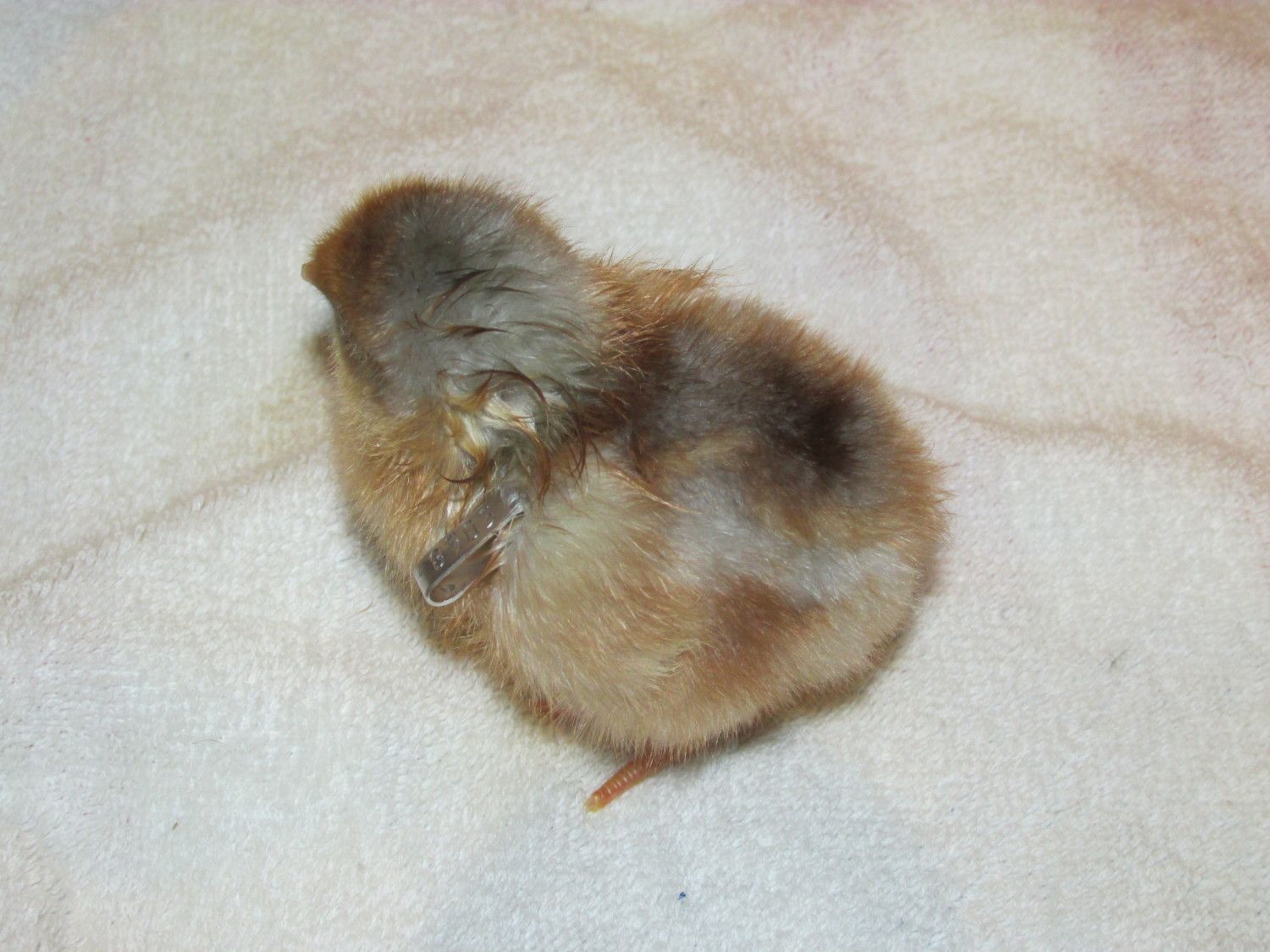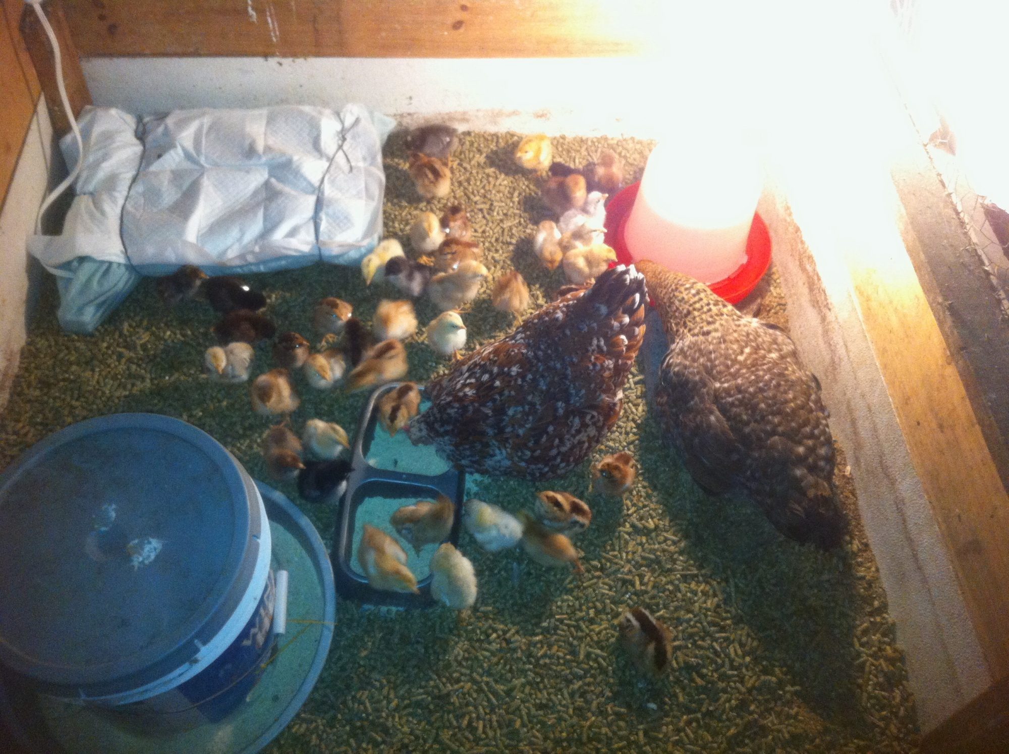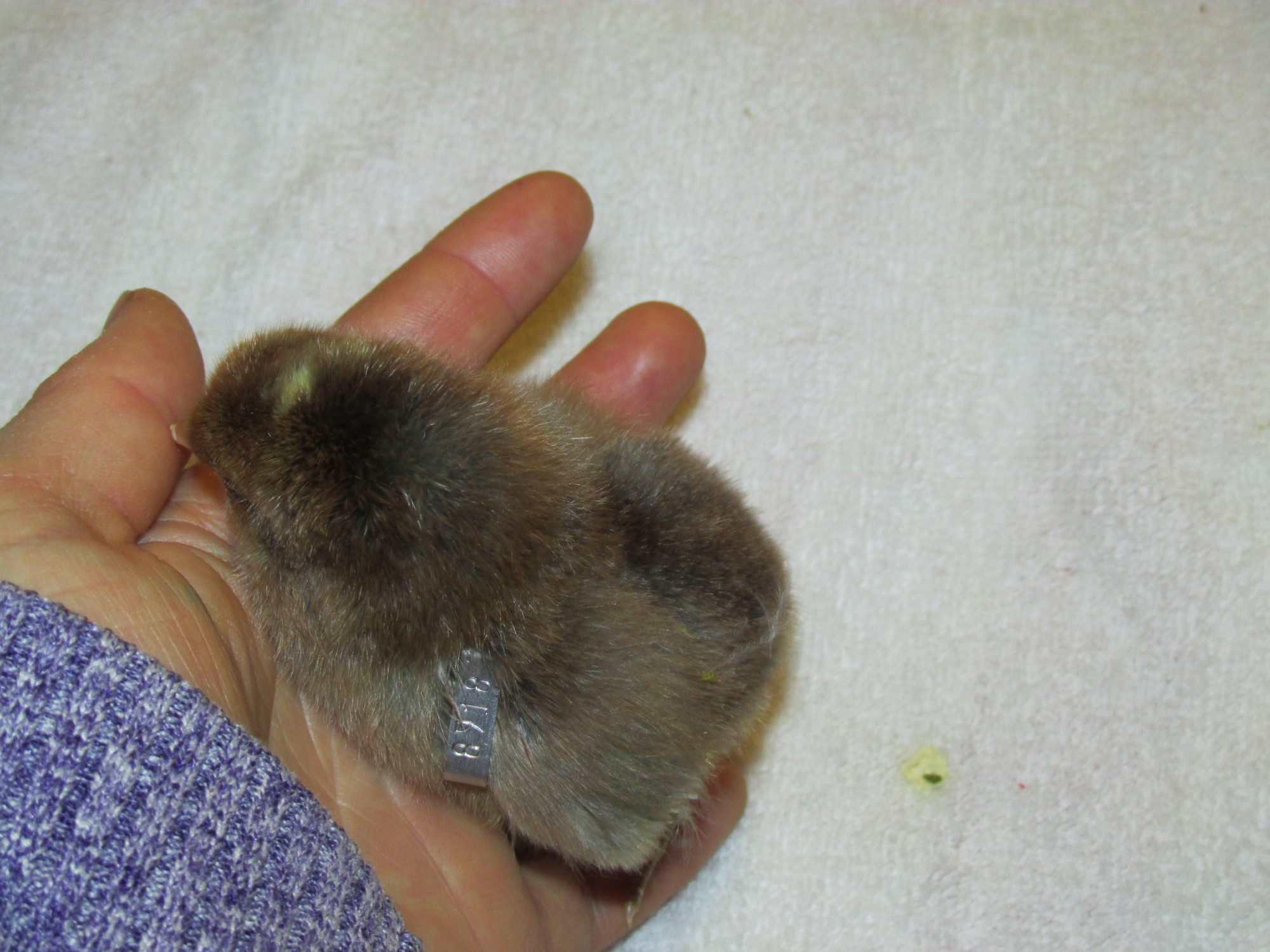 Nice colored chicks.@draye - yes, I usually only count the fertile eggs for hatch percentage. Actually, this time I had a few extra eggs under broody hens (not included in the total), but about a week before the hatch, the hen forgot which nest she was on, so the eggs got cold. Yet, 3 chicks still hatched (4 but one hatched early, fell out of nest & died), and I think there was 10 eggs total. Usually the hens have a much higher hatch %, but I was gone all day & left the door to the "broody nesting box" open, hence why she was able to switch nests. Not the best photo, but the 49 total chicks that hatched (one assisted chick, zipped 3/4 around but then membrane dried out + broody hatched chicks) were adopted by 2 broody hens & they're raising them in the outside brooder coop with the help of a "mama heating pad".A few of my favorite chick down patterns that are unique: I've had several similar to this hatch before, where the "chipumunk" stripes are in blue, not black.