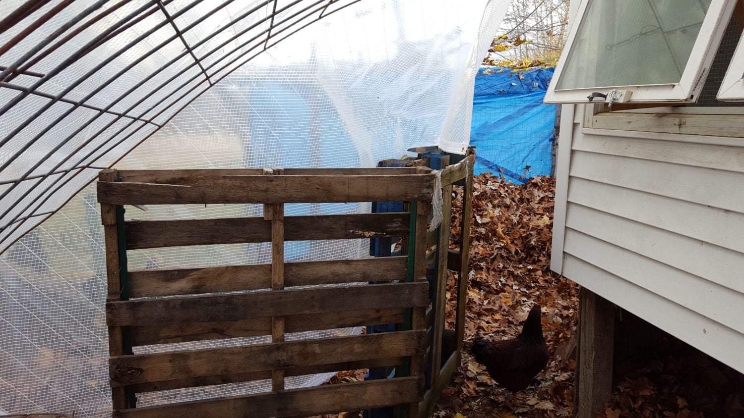 this is the end I will be walking into the solarium. I don't have a door to close here, but I don't really want to restrict the chickens movement, just give them a comfortable place to hang out if they choose. I like the fact that I can keep the windows of the coop open all winter for ventilation with out having wind and snow blowing into the coop.