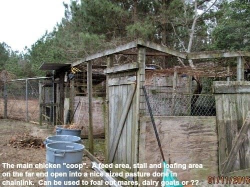 What we started with when we moved in. The "hut" needs to have ventilation opened up on the bottom - about 1 foot off the ground. And I need to figure out how to get the window on the back of it opened. That SHOULD be enough ventilation to allow us to have the 7 hens & 1 roo that are in the pen/coop now closed up in the coop if absolutely necessary, The pen is about 16'x16'. These chickens aren't pets and if our 4 oldest (hatched Feb 2011) have quit laying by next spring, they may go in the freezer.