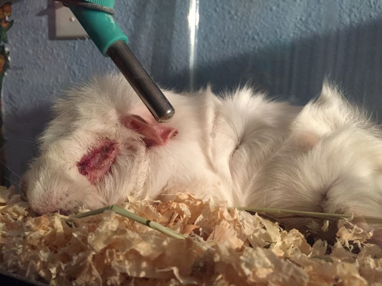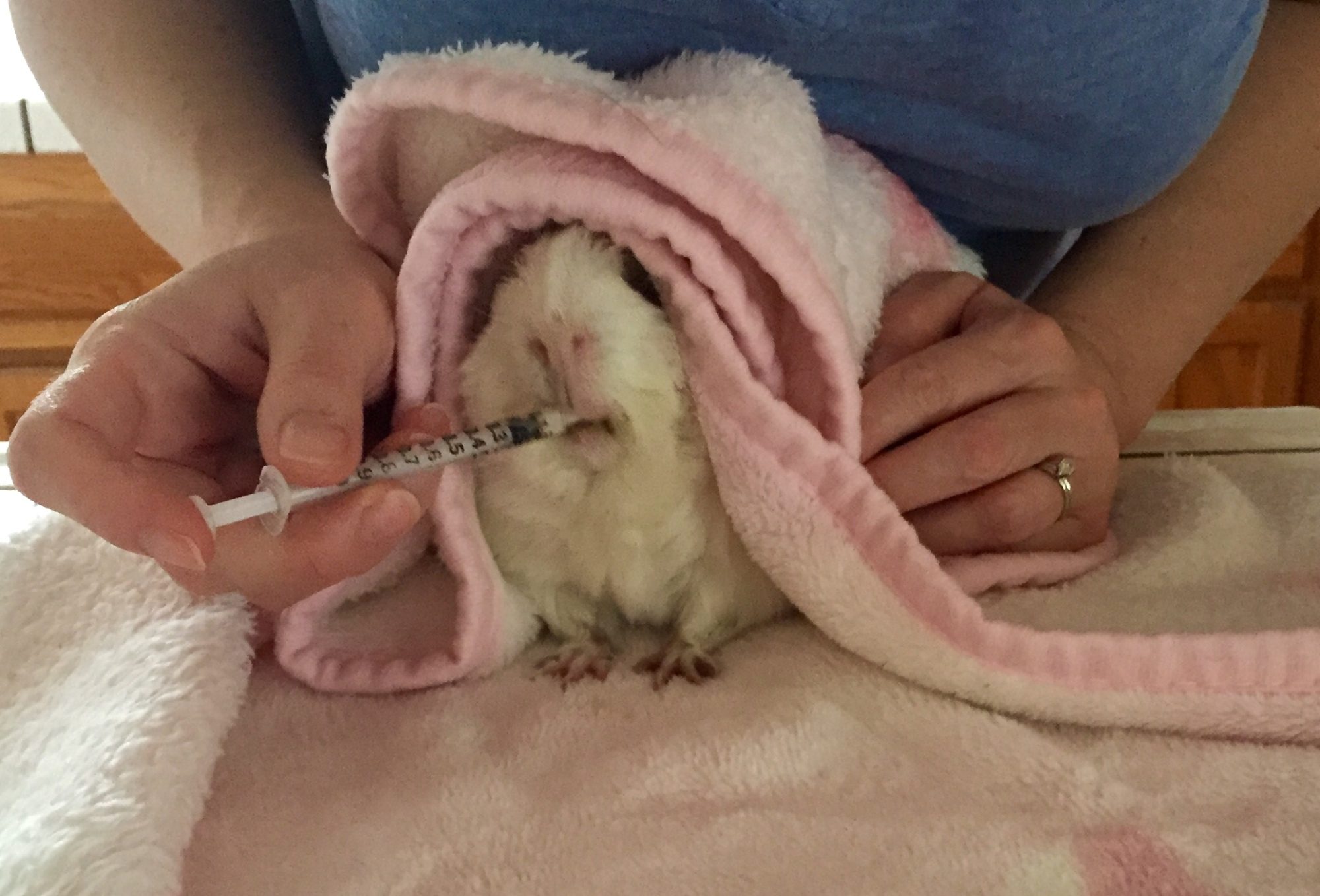 Being that it was a long weekend, it was the following Wednesday before an exotic vet could see him. Even though it was clear that the one eye was beyond saving, it was also clear that this little guinea pig was a survivor. He plowed through bowls of fruit & greens everyday, as well as eating his pellets & an ton of orchard grass. The vet agreed the eye could not be saved & opted to do an intraocular injection into the damaged eye. This apparently shuts off what's left of the eye without the stress of removing it completely. They put him on a six week antibiotic regimen that had to be given x2 daily both orally & optically, plus oral pain meds & anti-inflammatories. It was pretty clear that we wouldn't be paying a few of our bills that month, but it was also pretty clear that with some TLC the little guy was going to survive...