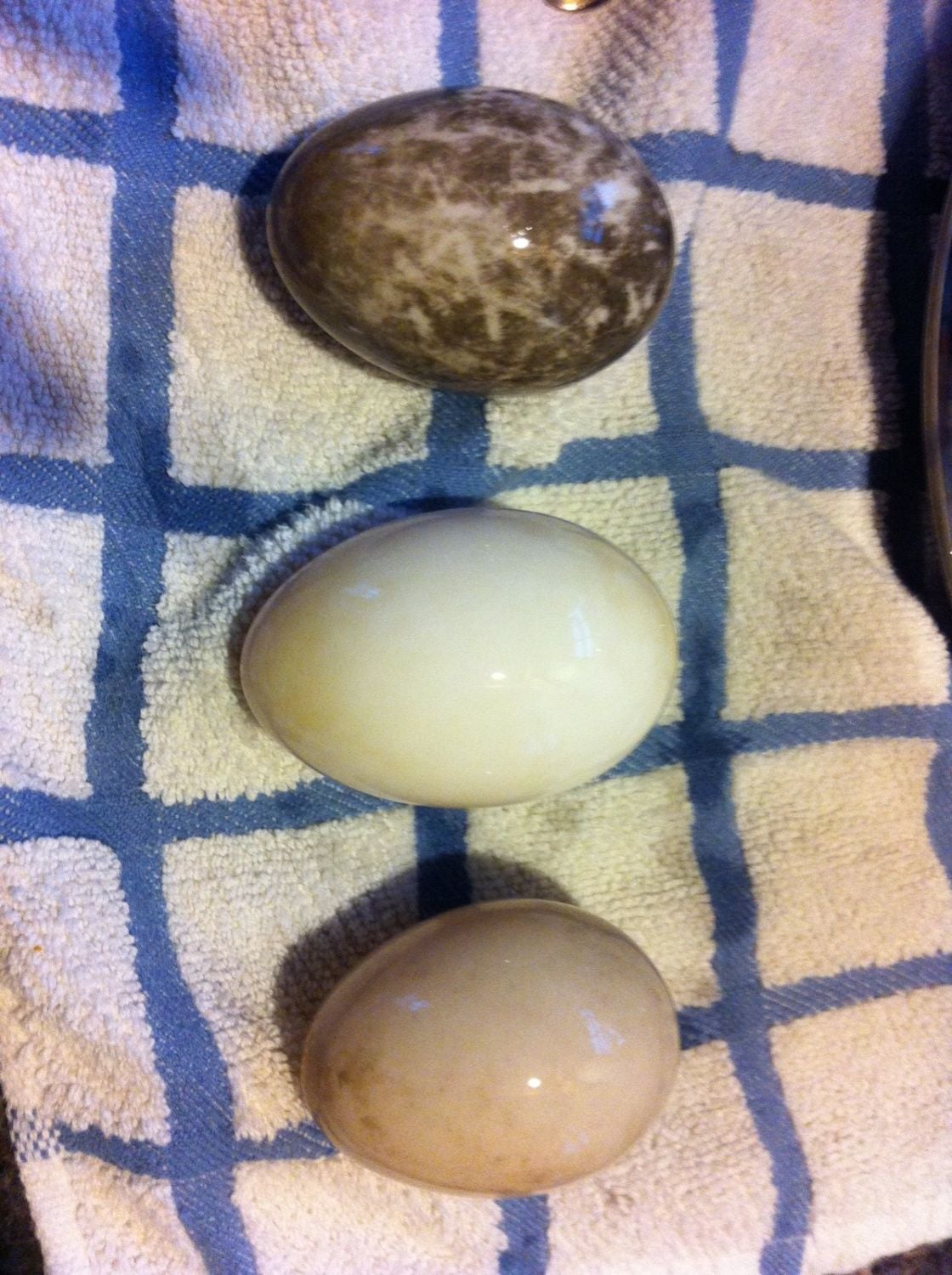 3 shades of cayuga eggs. Black, white, and "purple"