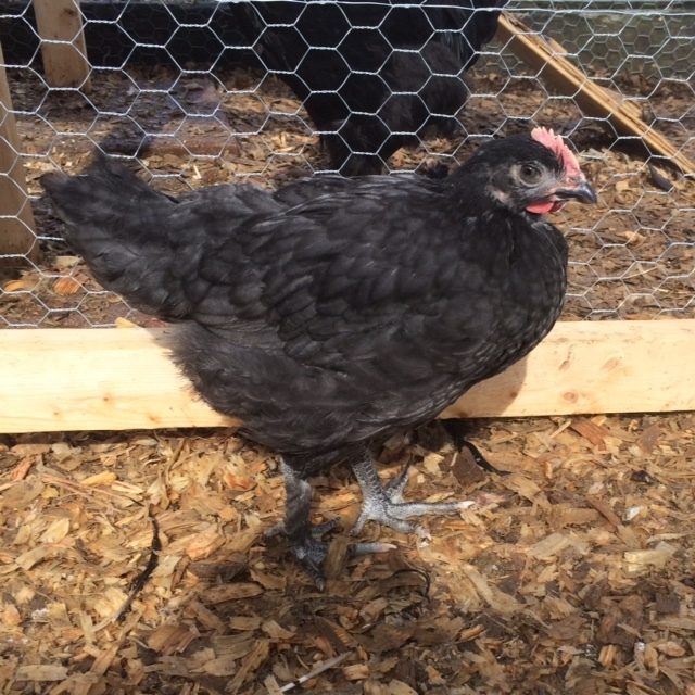 The fourth bird available is a 12 week old standard size black cockerel. He has a rose comb, sleek black feathers with a green sheen, and some sparse white or silver in the hackles. He's a mix from my Silver Laced Wyandotte rooster x black sex-link hen (different parent than the young males above). Both parent birds have good temperaments. This young male has shown no signs of aggression to people or his hatch mates. He watches over his group like a good male should.