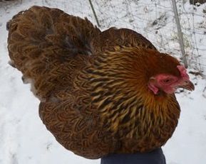 Here is Bea...her ground colour has progressively gotten darker as she has aged and thankfully, her thigh feathers came in firmer...much too soft in her pullet year!