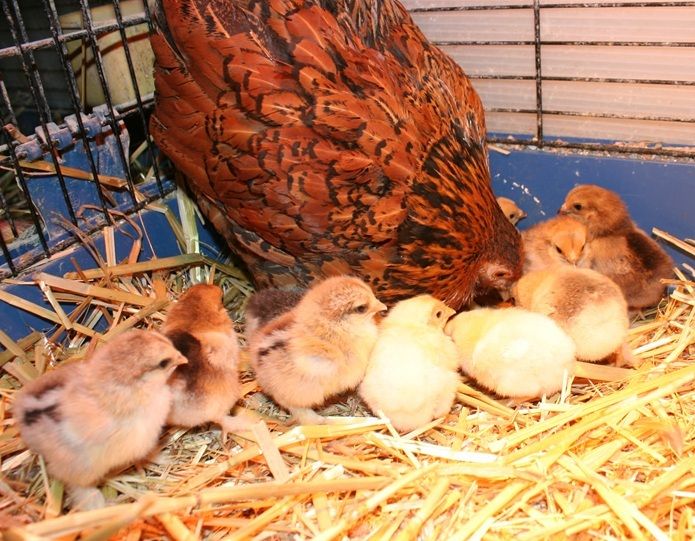 This female bantam project hen set and hatched out chicks several times this winter...here are ten bantam chicks of various breeds...no problemo fer her!!​