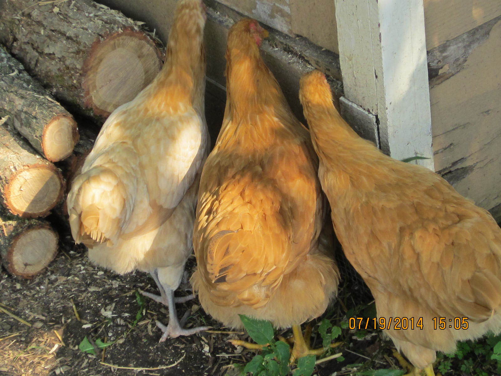 The two Buff Chantes, Dusty and Sandie (and their half sister the buff/ameraucana mix girl on the left is Powder)