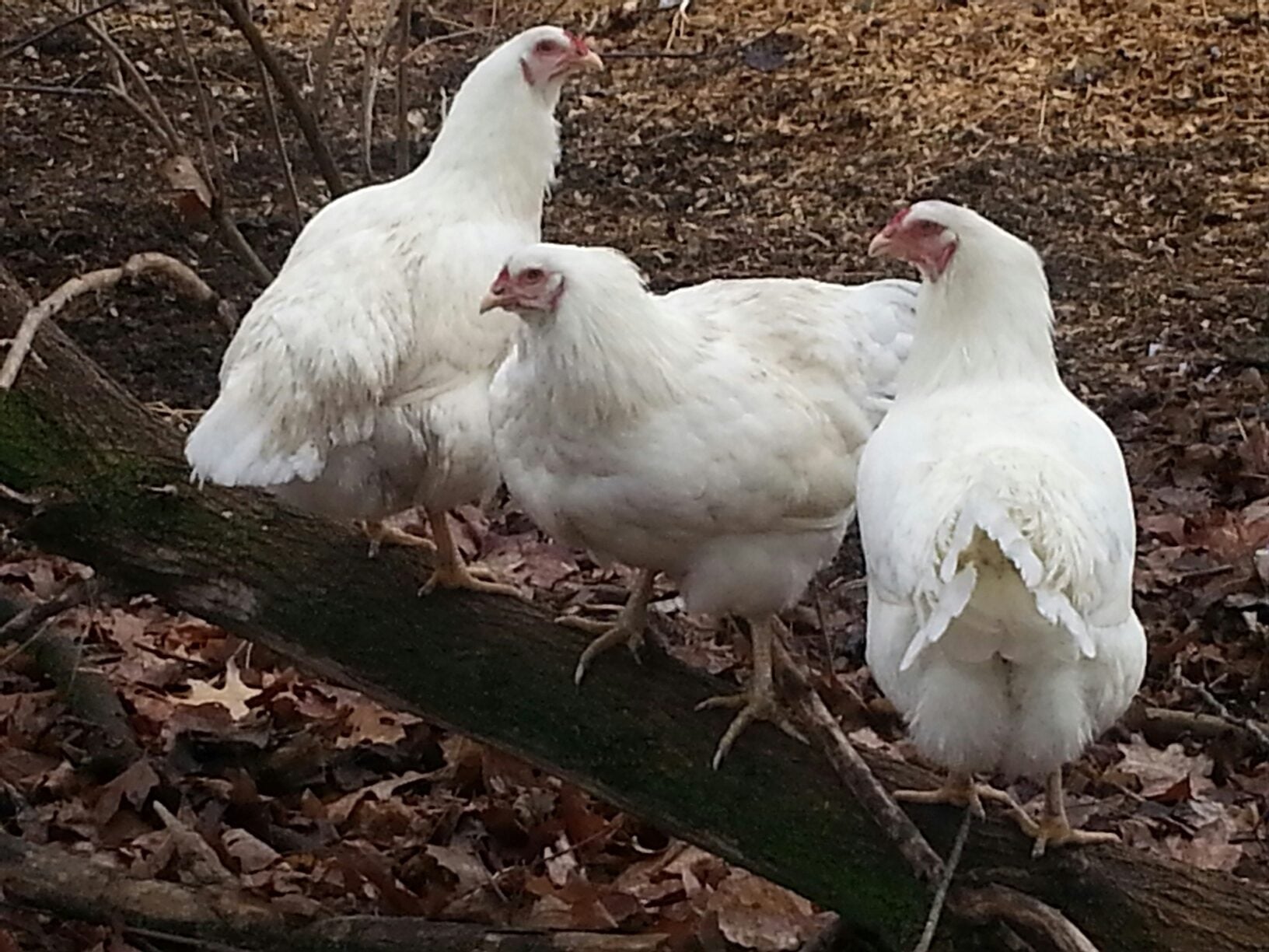 The hair they purloin is indeed gray!If those certain strands are the gray ones, I will certainly come to visit and they can get mine! However, my DH would lose what hair he has left under that circumstance. Here is a photo our our three white hens...Pearl, Laverne and Shirley. These ladies don't even challenge my 28 in high rabbit fence! Not sure if that shows how "smart" they are, but they are beautiful birds nonetheless.![]()