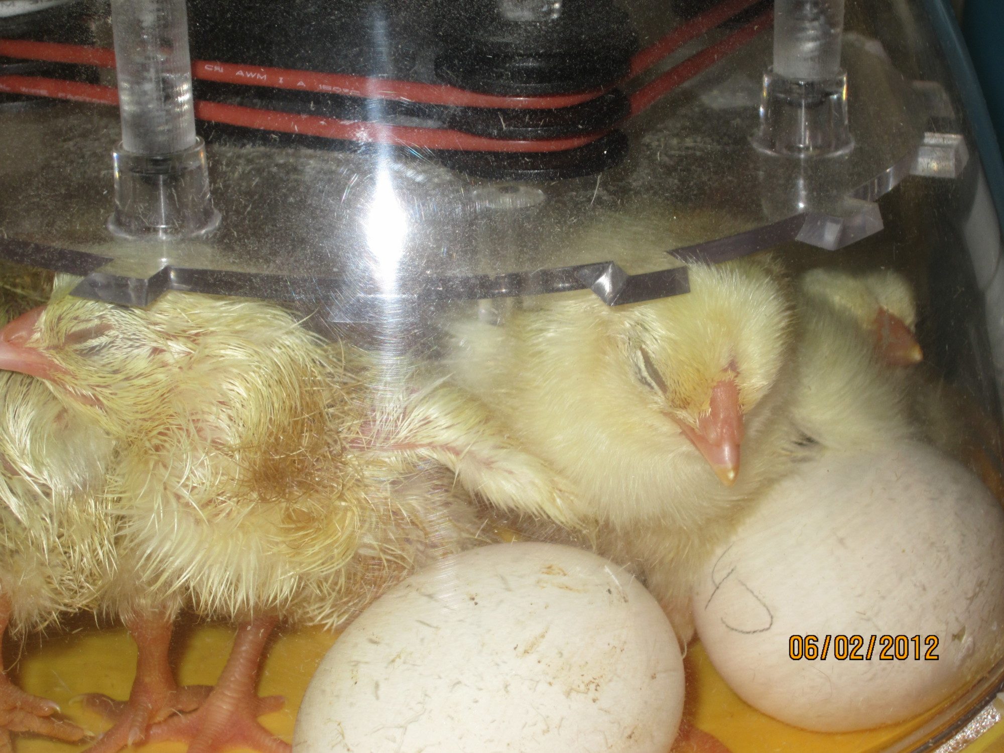 Incubator full of little chantecler's from Jim Hall. 2 eggs left to hatch setting in front, chicks behind....