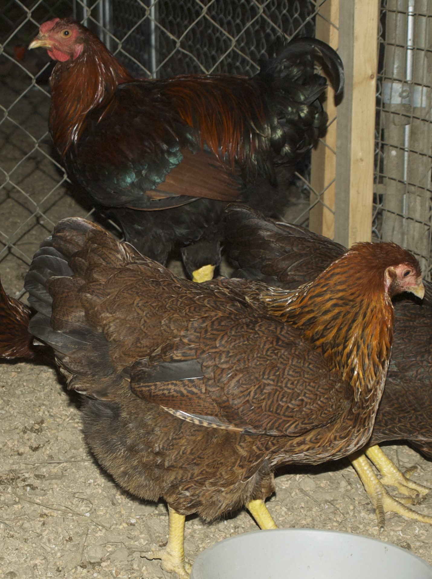 The Partridge Chantecler needs a lot of work in the tail department. What you are seeing is hens with short tails The hen without the tail sticking up will have a very short bunny tail. The other pullet will still have a short tail, but it will be longer. Medium length tails are desired.