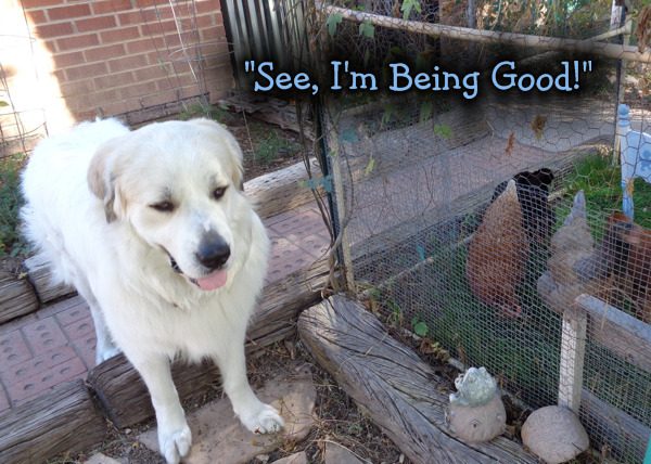 getting him to settle down and not do big "play postures" at the chickens.