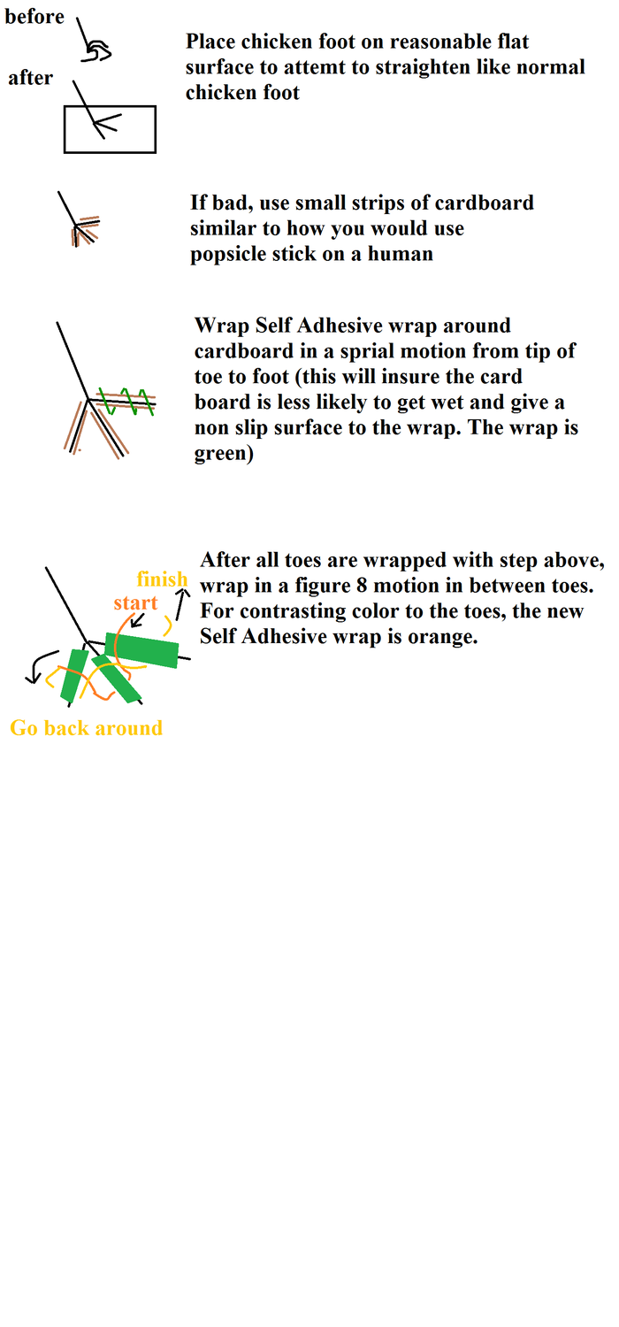 Take small strips and wrap the toes like you would tape your toes if they where broken (I hope they are not) then like a figure 8 around toes to spread them. Be careful not to wrap them too close together or too tight. It's kinda like bumble foot wrapping but different because of the toes. I'll try to make a picture or something.