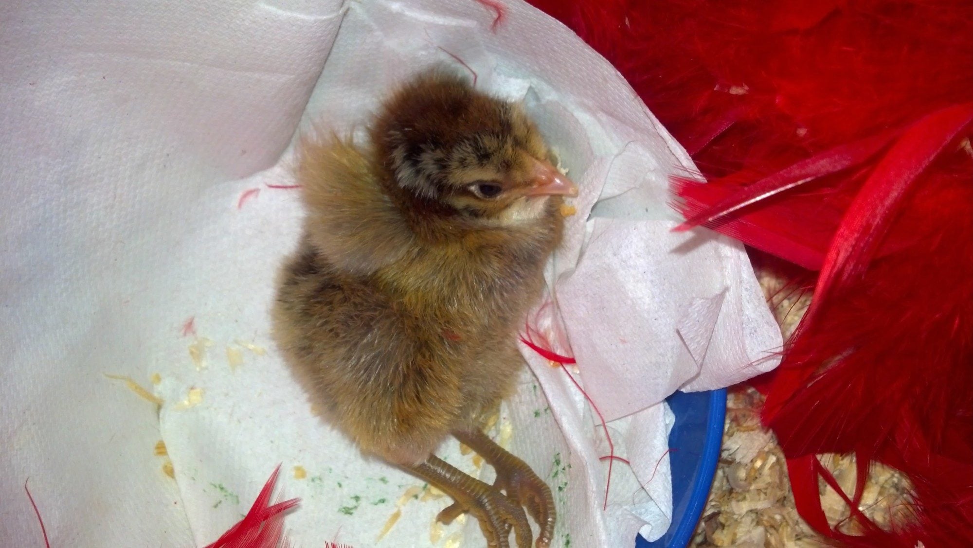 I have a day old chick that cannot stand up and I am having trouble figuring out what, if anything specific, is wrong. Here are the symptoms: 1.) It cannot stand or walk on its own. When I place it upright it falls over on its left side and then flips further onto its back. 2.) It appears twisted toward its left side generally.It's legs look normal in isolation but again seem not quite oriented correctly and seem to cant toward the right side of the body 3.) It's wings do not look like they lie correctly on its body. They seem stuck in a raised position. 4.) It is very large for a newly hatched chick and appears to have a distended abdomen compared to the others. Here are some pictures. It is alert and has eaten a little grow gel from my fingers. I have it in the brooder propped up in a bowl. When it gets stuck on its back it is clearly very agitated but cannot flip itself over and is definitely is not moving independently.
