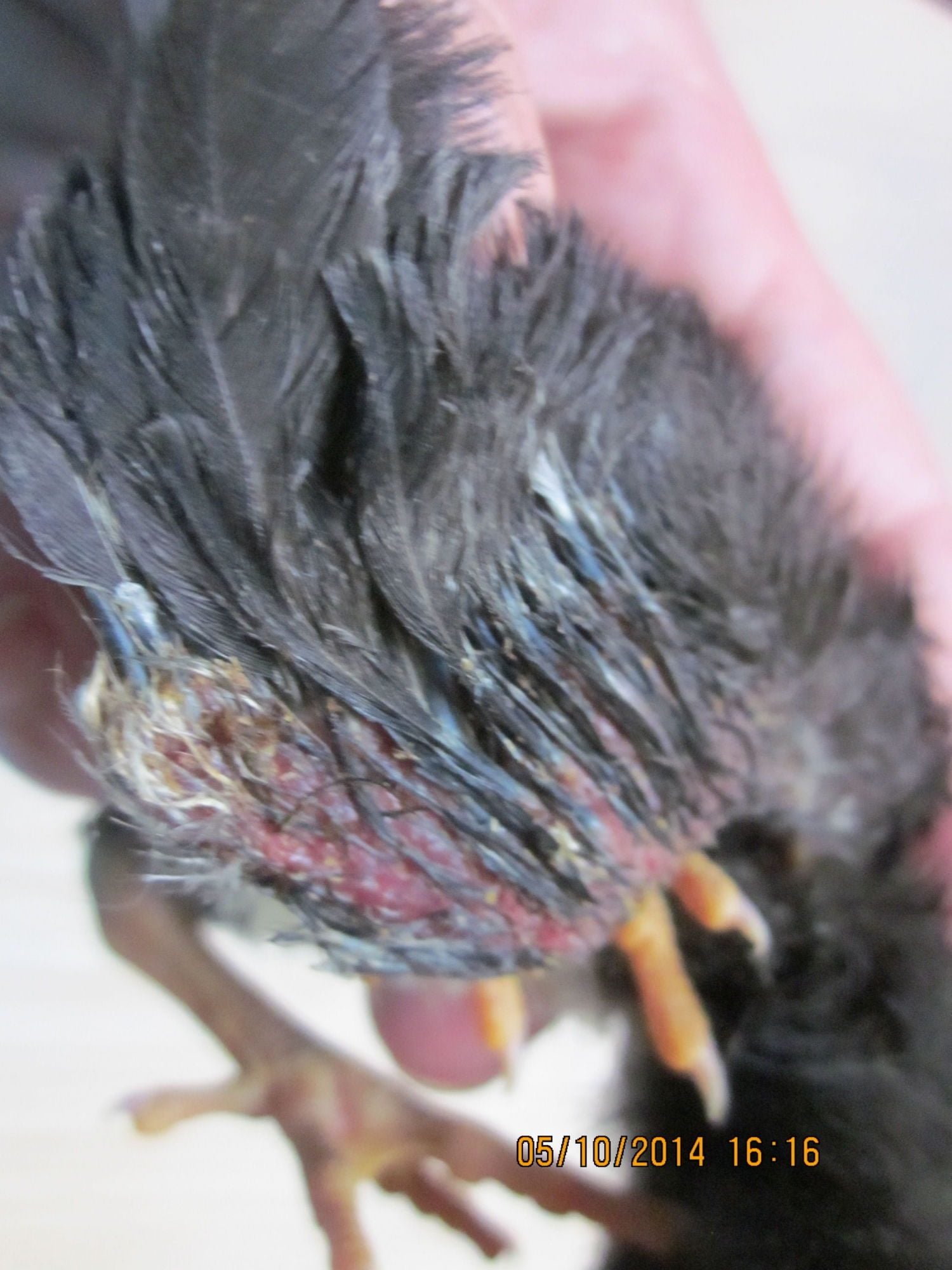 Put the wing in a neutral position and secure it to her body with Vet Wrap (also marketed as Coban for humans, but wickedly expensive). Leave her other wing free of the wrapping, so she can learn to balance with just the one wing. Change the wrappings whenever they get wet or soiled. She will need to keep that wrap in place for several weeks to months. Fortunately, she is young, so she should be pretty OK with handling and care. Ice the area as often as you can for the first couple days. The ice should help with the swelling. No pain medications should be used on her, since the only real painkiller safe for birds is aspirin and she should not have that since it increases the risk of bleeding. Broken bones bleed a lot anyways, so you don't want her bleeding out anymore. It will just increase the swelling. Do not be surprised when her skin all turns green in a day or two. Birds bruise in day-glo green. It is very alarming the first time you see it.