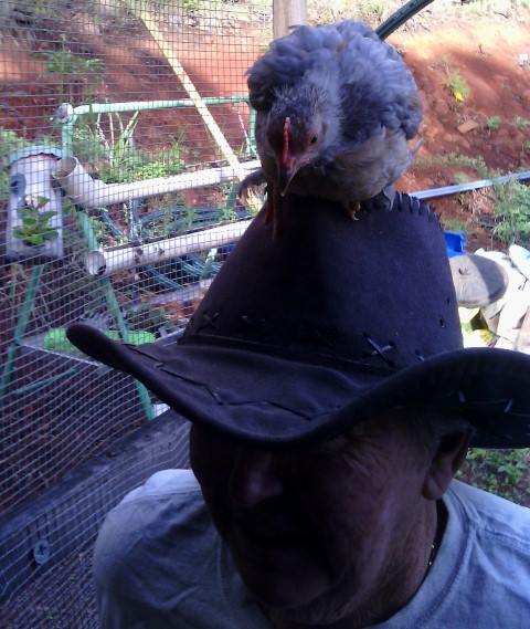 But, guys, that's my story. If it helps, that's great. If not, I'm sorry. But hopefully it was an interesting interlude into my life with chickens in Australia and filled in a few moments of your day. Following are some pics of some of my bird and their various "habitats". The pekin on my hat is "Chickadee" and my absolute favourite. He is much younger in this pic and has grown into a really pretty bird.