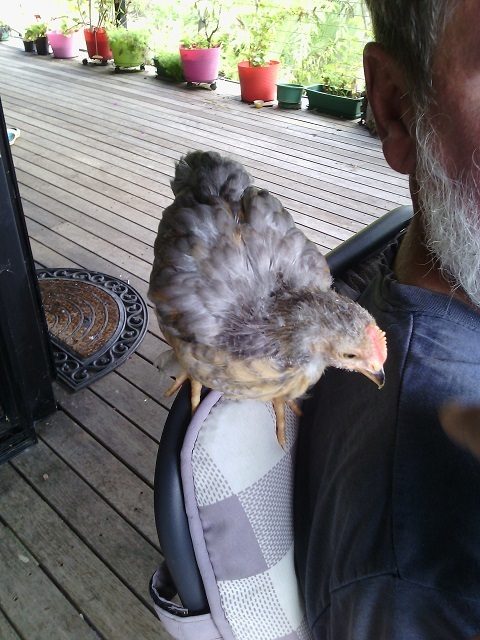These chicks grow up being totally used to humans and even those that I keep (generally because I fall in love with them and can't bare to part with them) remain happy to be picked up. They will even jump onto perches or the tops of their houses so that they can reach our shoulders, heads, arms and even our backs if we are bending over at the time. That makes it a bit hard to walk around at times, but they are enjoying themselves so we let them!