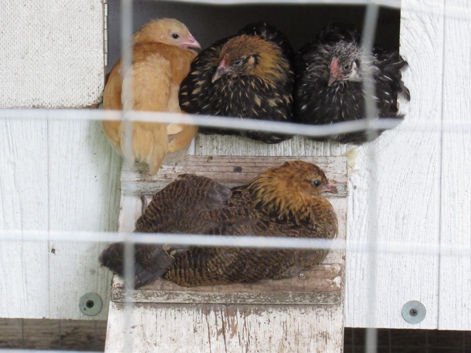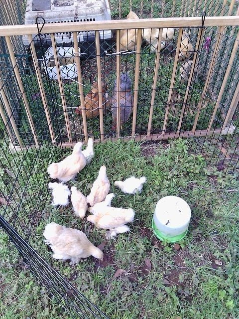 I've made some progress as my BO (Buffy) has learned I'm not evil and the hand is a nice warm place to lay. She's only gotten comfortable being handled about 2 days ago and loves it now. She fusses for a second when I first pick her up but lays down and enjoys laying in my hand. She and my skittish Americana (Libby) pal around the run. Yesterday while I was holding Buffy, Libby flew up to my arm and tried to push her out of my hand which she wasn't going for. This morning I was sitting on my stool holding the Wyandotte sisters (actually one gold (Goldie) and one silver laced (no name yet) on one leg and Buffy on he other. Buffy went to sleep and her friend Libby jumped up on my leg next to here and laid down beside her. I was so surprised as she never wants any human interaction. It didn't last long as one spotted something to chase and they had to join in. Buffy just laid there and went back to sleep and soon Libby jumped back up with her and settled down for a bit. It just takes time for them to get comfortable. I feel like Libby accepting me is a milestone event. Here the latest family portrait.