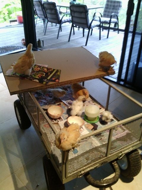 The chicks get constant attention, picked up - but never from above - allowed to wander all over our bodies as we sit on the lounge (sofa) - no sitting on the floor at my age of 72 as it's too hard for me to get up with metal knees!! They even sometimes come to bed with us where they run all over the bed which is covered with an old sheet for the "gifts". (Don't worry, we don't fall asleep while they are there so no worries about squashing them! I've had babies of my own, I know the problems.) If there is a time gap between the hatchings, I remove the older chicks, putting them into a spare brooder for a few hours and put the babies into the regular brooder. When I replace the older chicks back into the original brooder there are no pecking order arguments with the bubs. After a few days (it could be a week, depending on the temperature) the chicks then progress to a four-wheeled trolley that is much bigger than the brooder and gives them much more room to run around in, and on sunny days they are taken outside and put into a large cage without a base so they can experience grass and learn to scratch. The free-ranging chooks and ducks all wander over for a look and a chat with the babies. If the weather is cold (it's May now and it's beginning to cool down, even in the tropics) so the trolley chicks will be returned to the second brooder under the lamp for the night.