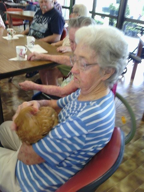 I have silkies, pekins, Australorps (for eggs), Araucanas, Silver-lace Wyandottes and some mixed. I find the pekins the friendliest; the Wyandottes the calmest - I bought a trio so didn't have anything to do with their early progress. Although they initially dislike being picked up, once in our arms they are happy to sit quietly without being restricted in any way - even the roo. I am not sure of their exact age but the girls should be just about ready to start laying. I especially love my pekin roos. Some don't even crow and they are so beautiful, friendly and attentive. When someone wants a trio from me I find it very difficult to let them go.