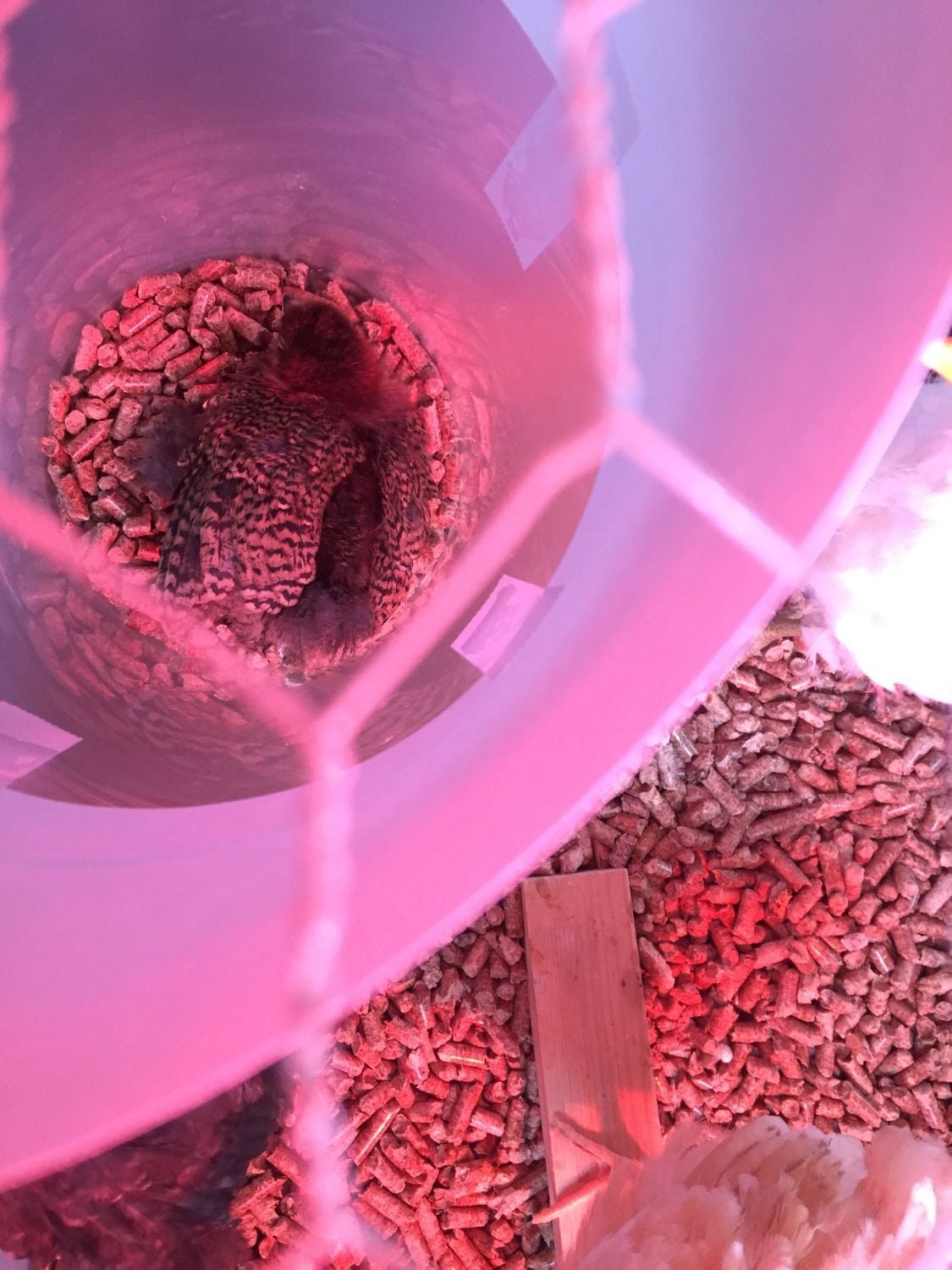 So I have her rigged up inside a clear/frosted trash can down inside the brooder so she can kinda see but also hear her brooder mates. She is limited in her movements in there too. And she seems calm, whereas when I had her in a separate brooder container, she frantically was searching for her buddies.