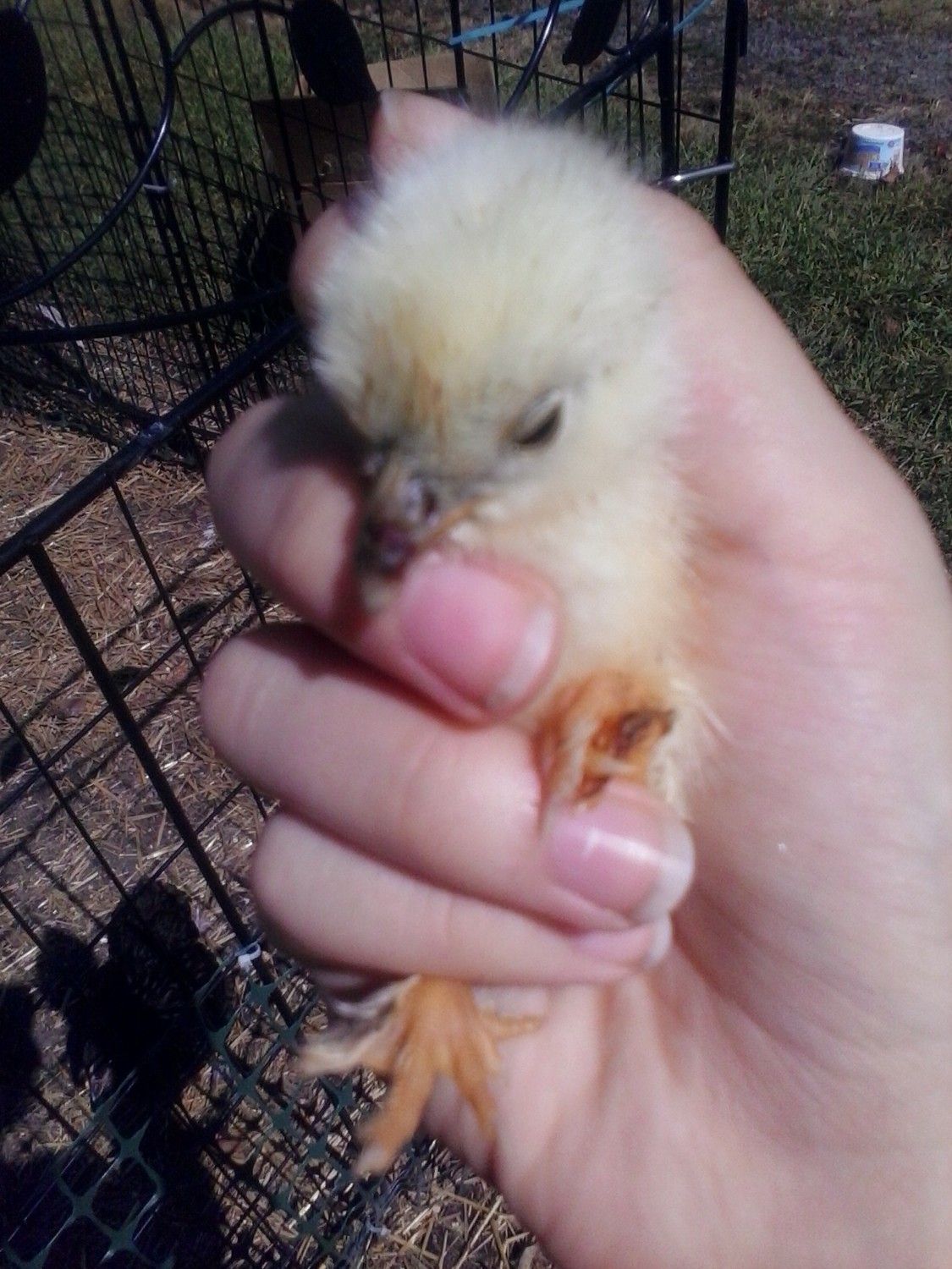 Here's a picture of the little guy! As you can see (kind of.. I don't have the best camera) there's one deep cut going through his little beak. It's hanging on there, but just barely. When I apply ointment, the very tip wiggle just slightly. The rabbit also got one of his toes, but that's not as concerning to me. Other than his beak causing some slight pain, he is drinking pretty normally. I haven't tried feeding him yet. He's active and chirps his little head off. Also, I promise I don't keep the babies outside! The lighting in my home is just awful!