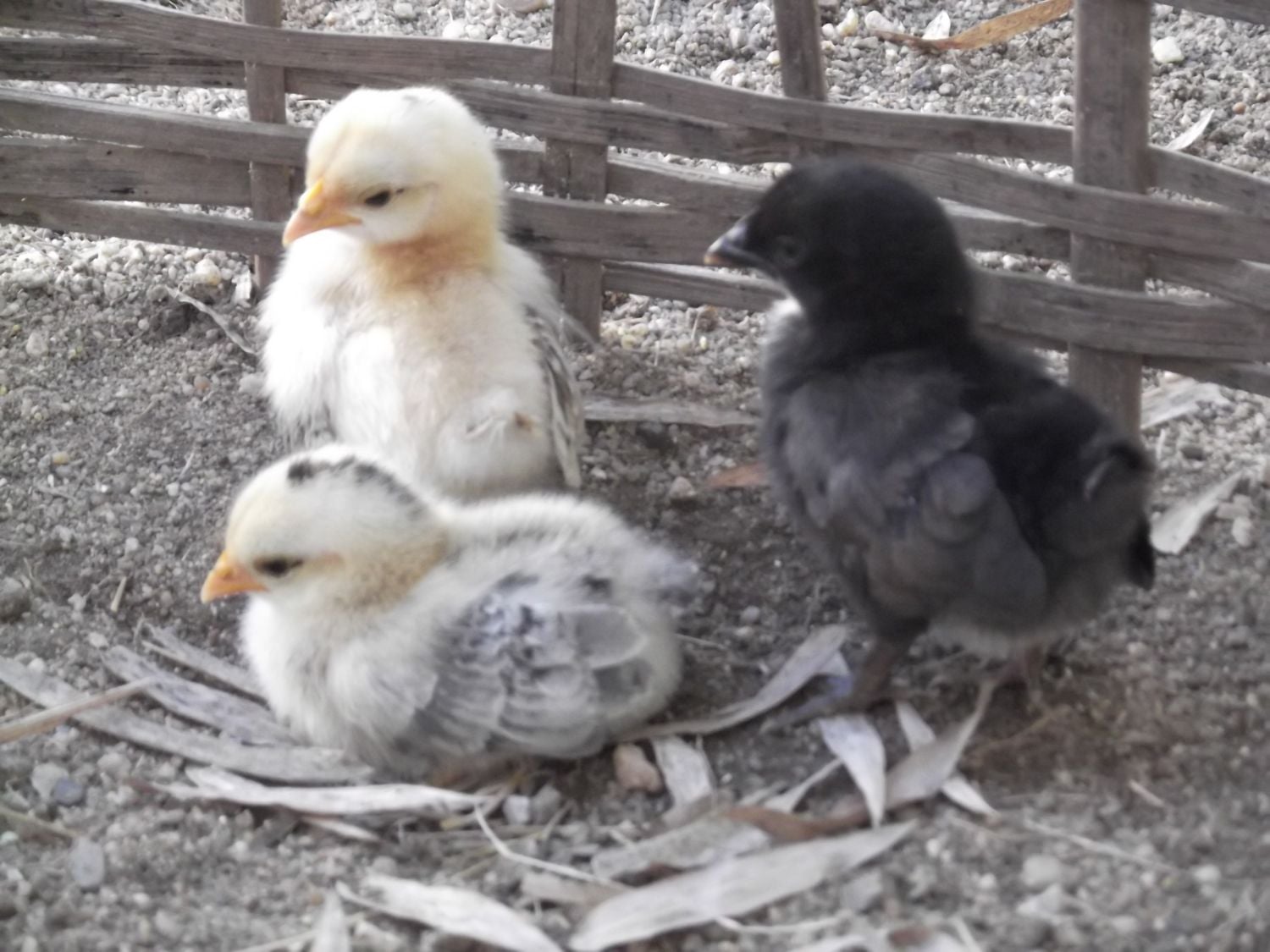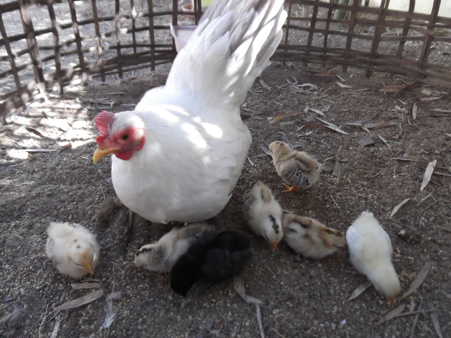 I have put the hen and her other chicks in a large cage, and have left the black chick with the broken wing outside the cage where it can stay close to the mother hen, but not get attacked.