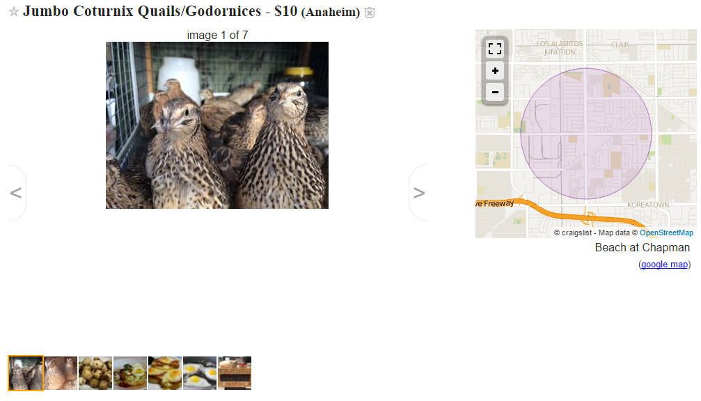 Hi guys, I know that there is a super slim chance or maybe none at all, but I was wondering if any BYCers in the Westminster, CA , Garden Grove, CA, or Anaheim, CA region as ever bought their chicken or quails from this seller on the OC Craigslist? Whenever I go to search for quails on craigslist this seller is ALWAYS there. I was looking into having quails and I did not want to buy fertile eggs online and hatch my own (and I also did not want to have to buy a large quantity of quail chicks) and this seller seemed like my best bet. If I remember correctly, I have seen this seller post on the OC Craigslist for about a while now (the first time i saw this seller was maybe 1 1/2 years ago but they had a different location listed: Magnolia & Westminster now its Anaheim). Thanks! Oh, one more thing, is there any advice on what to ask sellers to know they are actually knowledgeable/good sellers on chicks/quails?