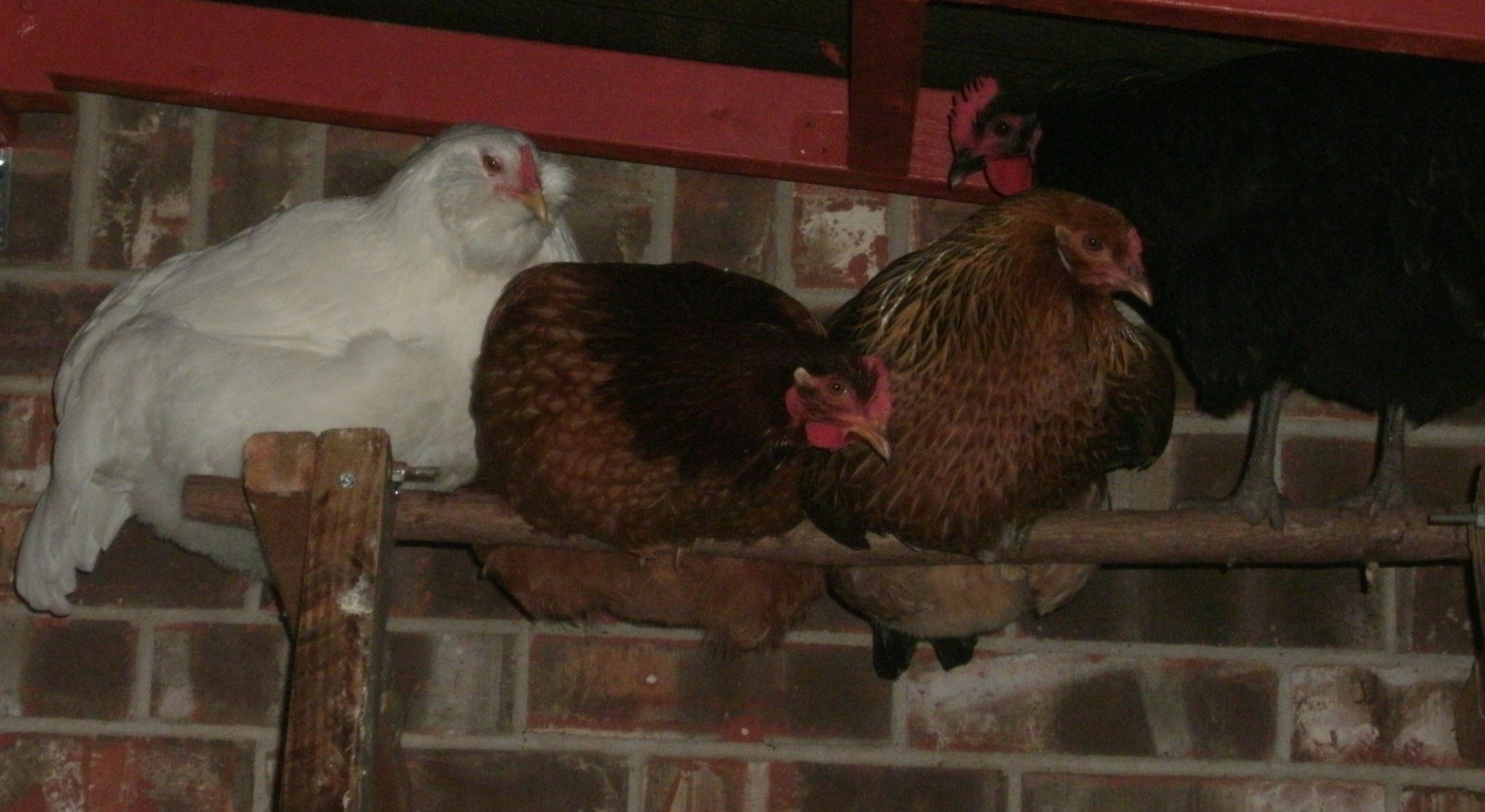 Here are my chickens. I took a picture of them while sleeping tonight. The black one is named "Black Beauty", and she's a black sex-link. The one next to her is an Americauna (Stinkerpot). Then next to her I think is a Rhode Island Red (Goldie) , and next to her a white EasterEgger (Angel)