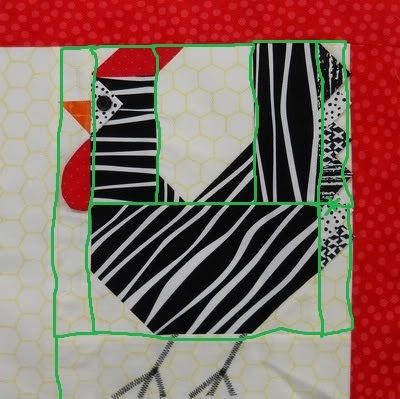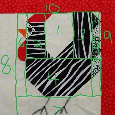 The background center is a rectangle w/ the corners sewn to them in different sizes similar to the snowball, or flying geese. The body is the same a large rectangle w/ two corners (the bottom ones) sewn two them. The comb and beak are the same rectangles w/ one corner sewn, the head and tail are just two rectangles sewn together. (the easy way is not cutting triangles but squares placing them on the edges sewing at center diagonally across the square pressing it then trimming the two back triangle edges leaving the top one.)