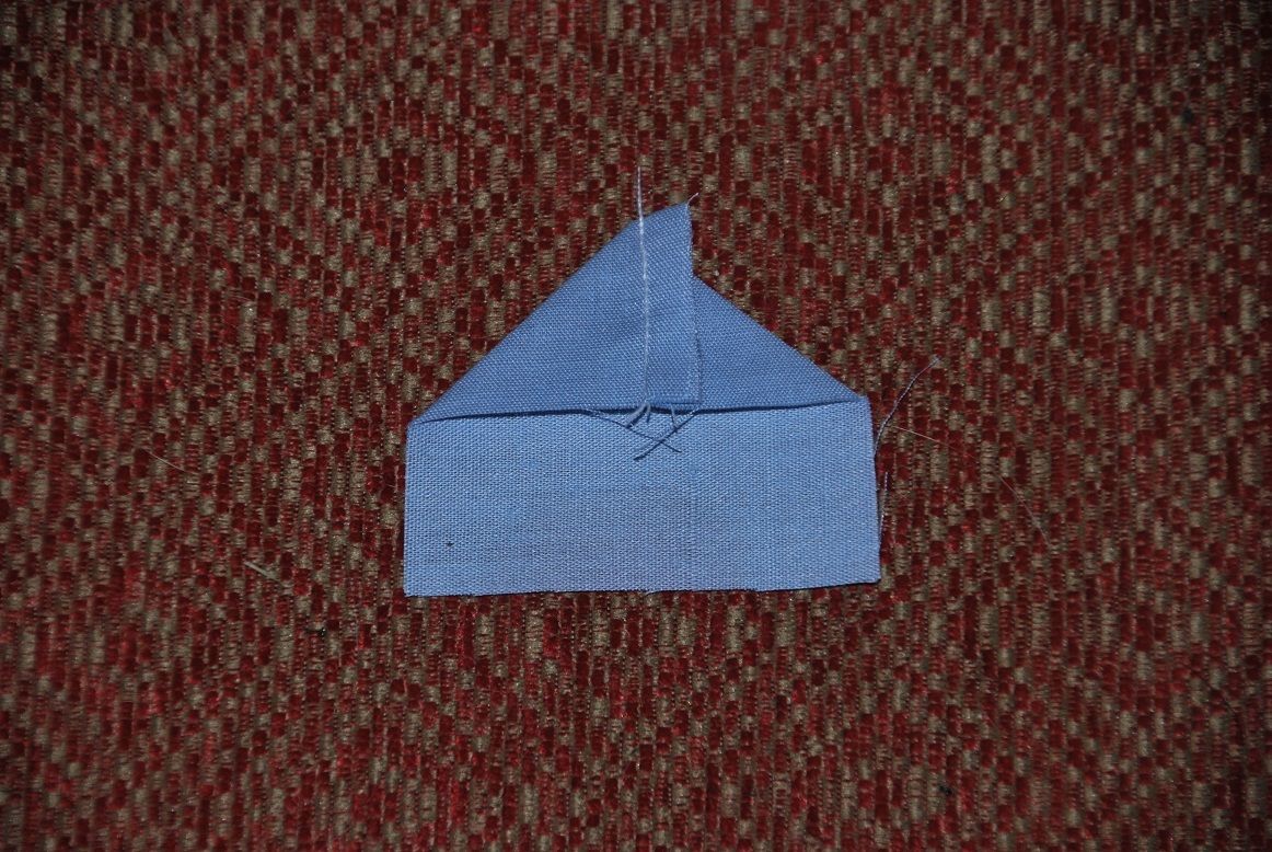 I do not know how to do the triangles in the tail and head, but suspect a square that is folded on one side and seamed then refolded and pressed so the seam is to the back and it forms a triangle, they are made then just placed in the straight seam of the two rectangles.