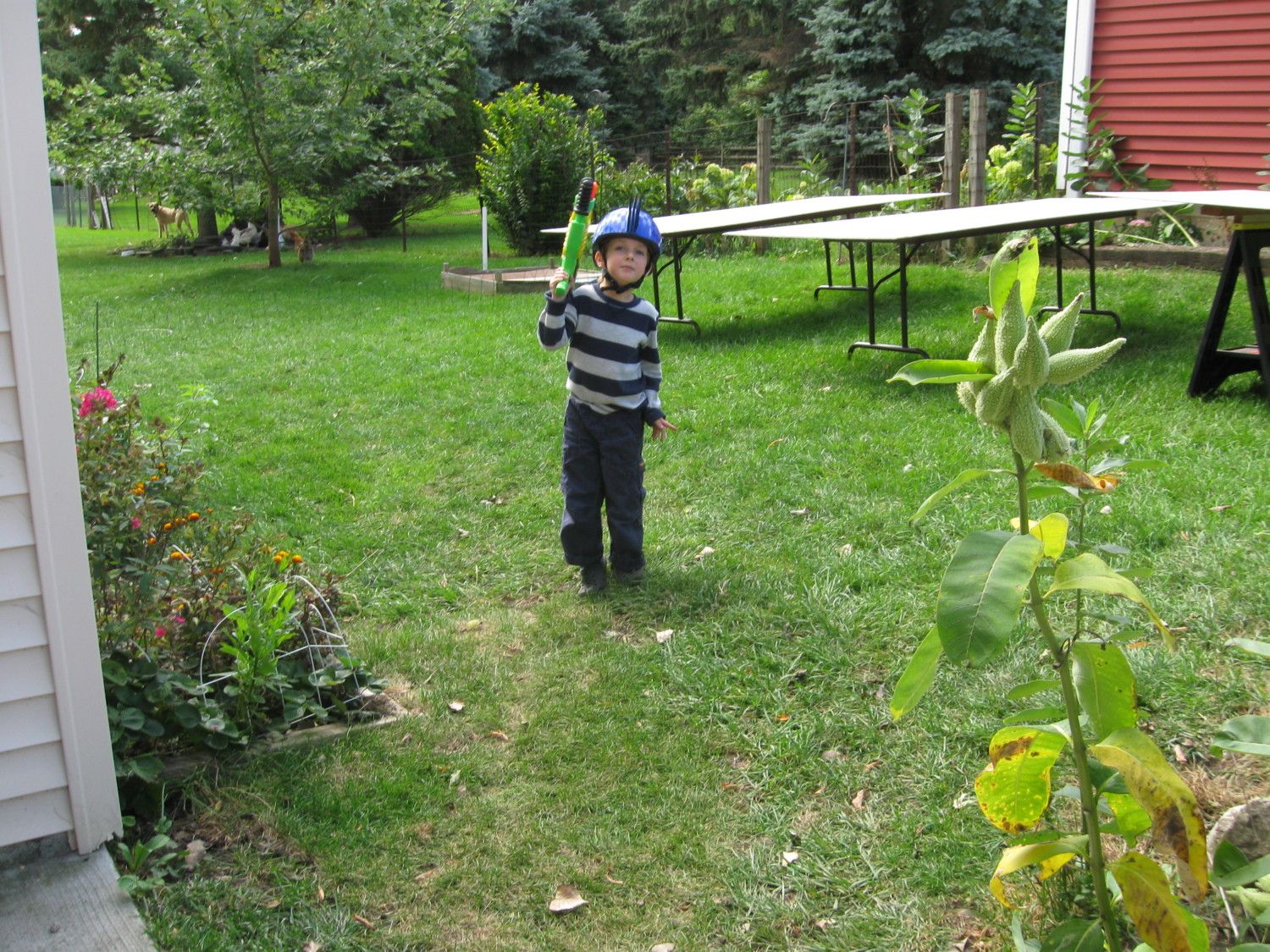 Next we used a preschooler with a super-soaker. This was both effective & entertaining, but the birds soon learned the school schedule. It also didn't work in the winter because I was not about to let them get wet in cold weather.