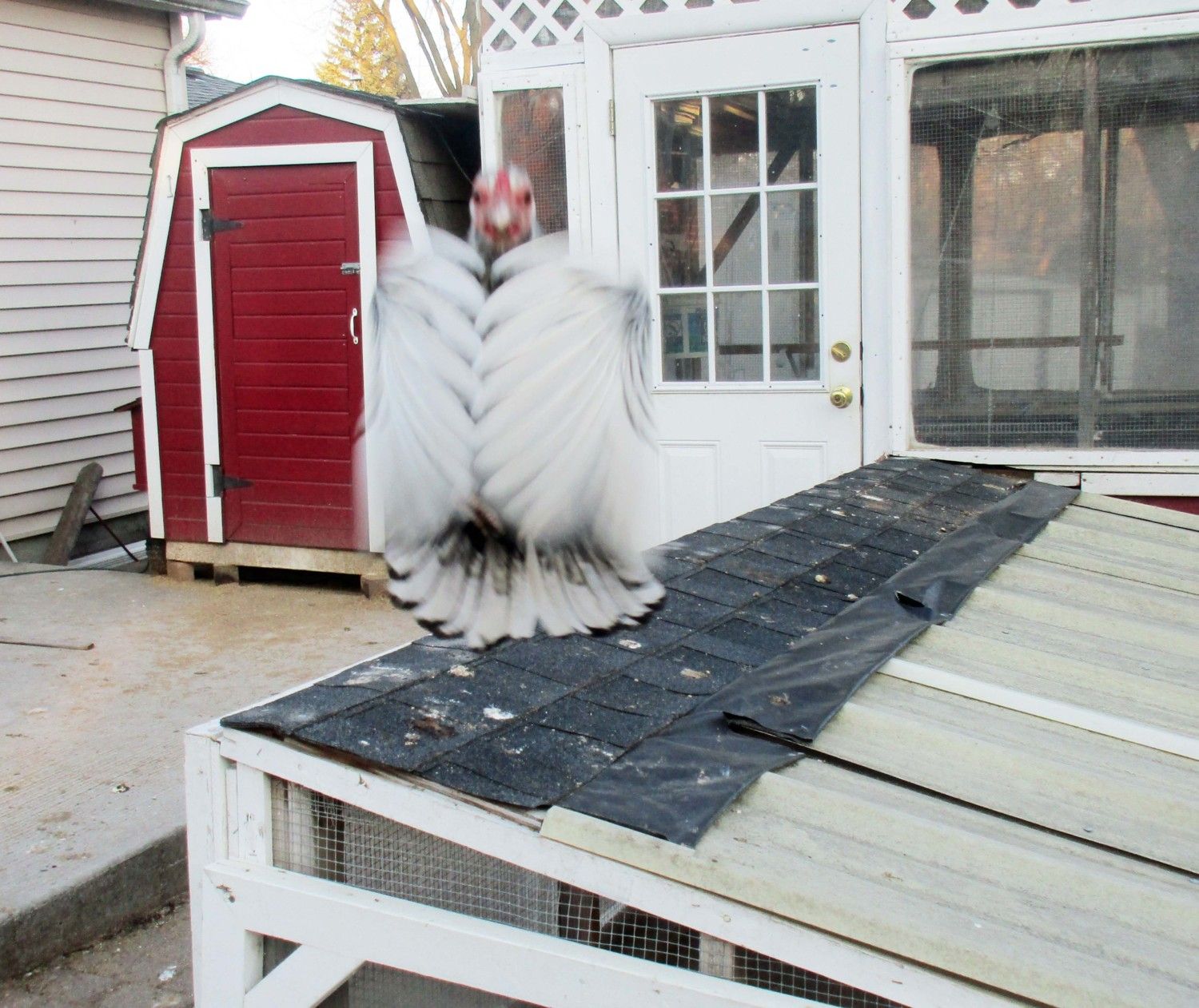 Speaking of Trouble, yesterday I brought my camera out to take some flock pics. I got this interesting pic just as Trouble took to the air. It looks like she's in a strange chicken burlesque show.